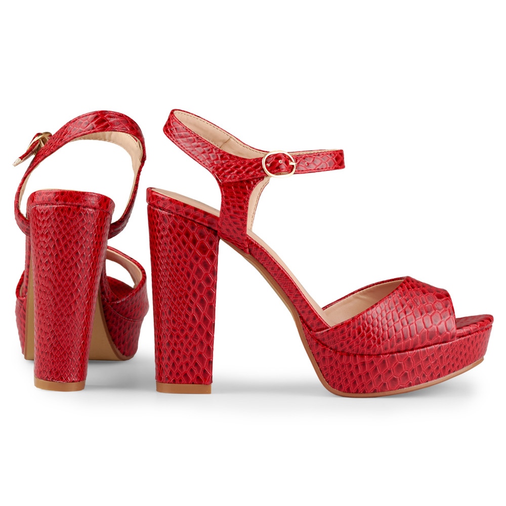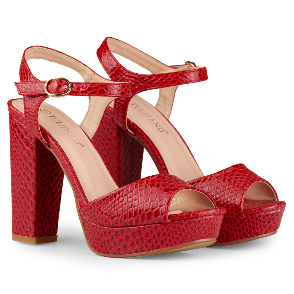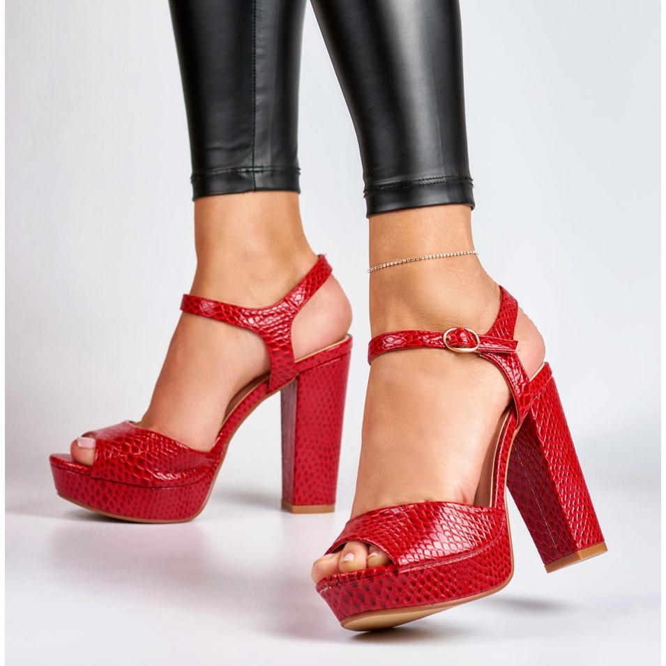 Partea superioară din piele ecologică lacuită într-o culoare roșu intens va atrage, fără îndoială, atenția, iar imitația la modă a pielii de șarpe adaugă un caracter sofisticat. Sandalele au fost concepute pentru sezonul de primăvară/vară, punând accent pe vârful deschis și croiala aerisită, care permite picioarelor să respire chiar și în zilele mai calde.