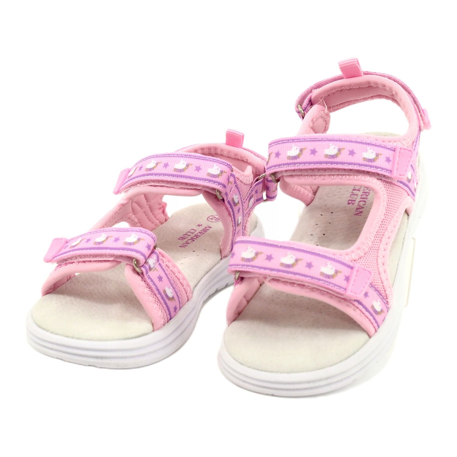 Sandale roz American Club RL39 - încălțăminte fermecătoare și confortabilă pentru un elegantka puțin. O combinație subtilă de elemente roz și violet și decorativ cu un motiv unicorn pe dungi va face ca fiecare ieșire să fie unică. Este alegerea perfectă pentru o fată căreia îi place să se prezinte la modă.