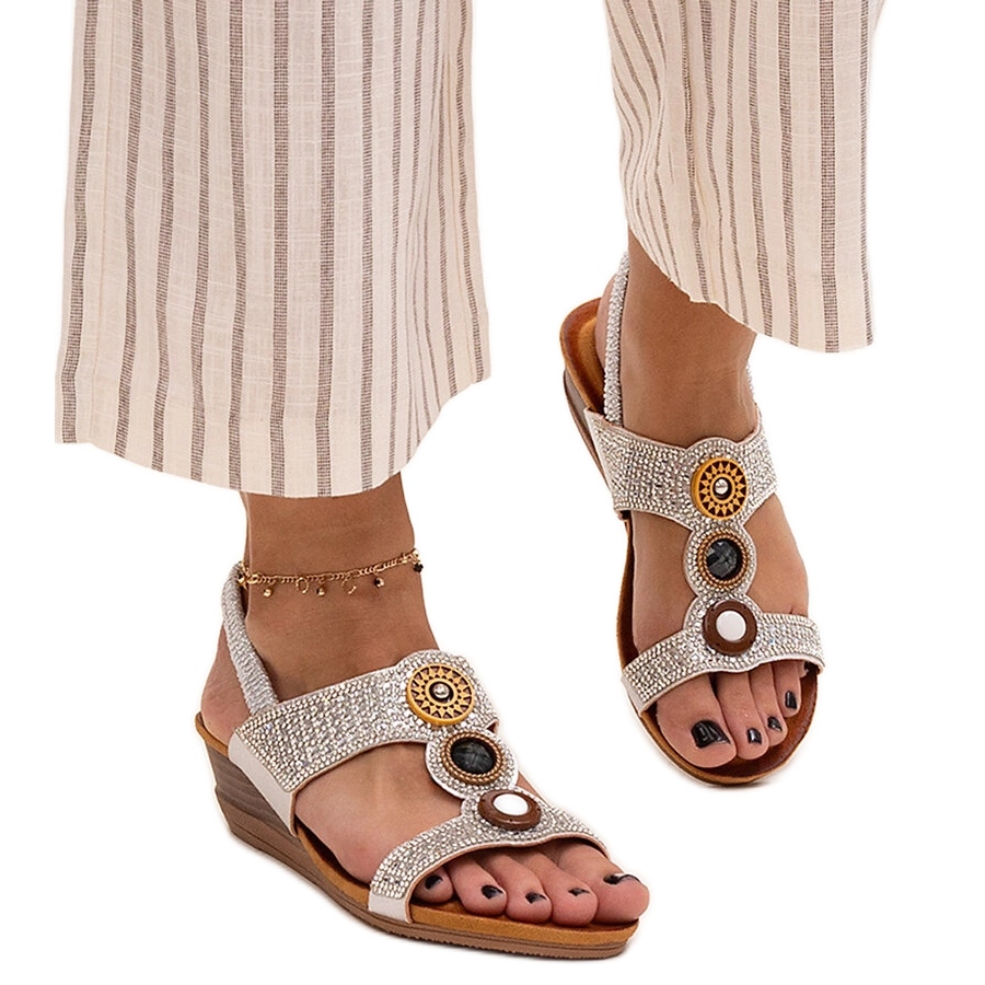 Sandalele decorate cu zircoane eficiente introduc o notă de strălucire pentru fiecare stilizare de vară, ceea ce le face o parte integrantă a garderobei fiecărei femei la modă. Panoul înalt de 4 cm le oferă un aspect caracteristic, care se încadrează perfect în tendințele actuale. Argintul în combinație cu o talpă bej înseamnă că aceste sandale se potrivesc cu multe ținute - de la rochii aerisite la pantaloni scurți de vară.