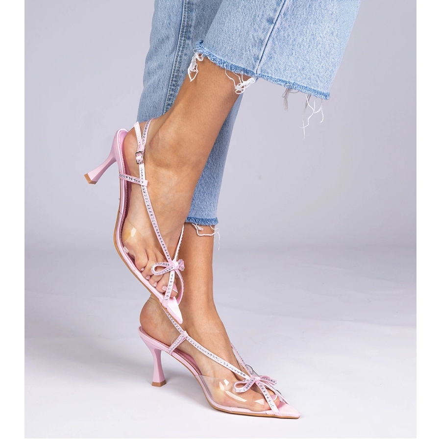 Detalii: Sandale transparente roz pe un știft cu zirconi