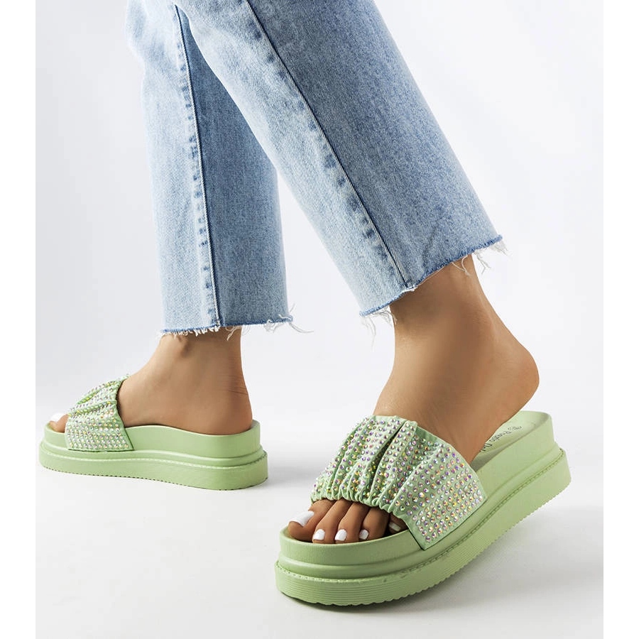 Produsul, slapii verzi Franet cu strasuri, sunt pantofi de dama eleganti si stilati, perfecti pentru zilele calduroase. Acestea prezintă un design unic care combină o culoare verde la modă cu zirconii strălucitori. Materialul exterior este material textil, ceea ce face pantofii usori si placuti de purtat. In plus, talpa de cauciuc asigura confort si stabilitate, iar lipsa degetului permite aerisirea libera a picioarelor.
