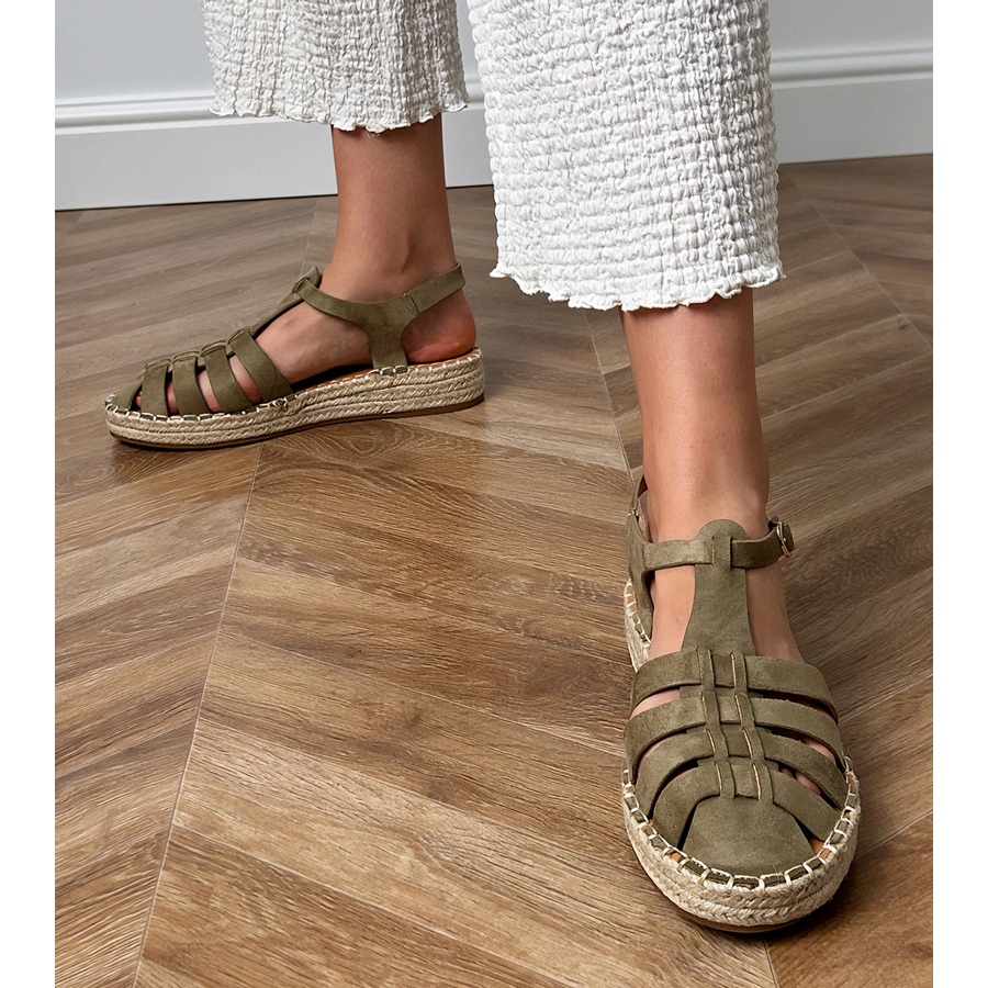 Green Sandals Espadrilles Gladiator de la Ekozamsz este o alegere extrem de elegantă pentru sezonul viitor. Fabricate din piele ecologică de piele de căprioară de înaltă calitate, acestea oferă nu numai un aspect elegant, ci și un confort unic de purtare. Un nas clasic, rotund și o fixare practică de fixare a cataramei garantează o potrivire perfectă a piciorului, ceea ce le face un însoțitor ideal pentru zile lungi pline de activitate.