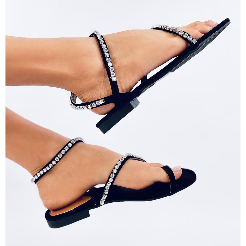 Descoperiți sandalele unice pentru femei cu strasuri negre - alegerea perfectă pentru zilele de vară! Aceste sandale din piele de căprioară combină eleganță și confort, ceea ce le face unul dintre cele mai la modă modele din sezon. Dungile lor senzuale, decorate cu pietre strălucitoare, își înfășoară subtil piciorul, adăugând farmecul ei unic.