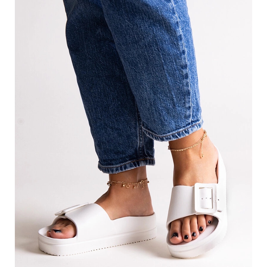 Clapele au fost decorate cu cuvinte cheie originale, ceea ce le oferă un farmec unic. În culori naturale, albe, se potrivesc cu multe ținute de vară, de la pantaloni scurți clasici la rochii aerisite. Înălțimea platformei de 5 cm oferă comoditate și promovează un aspect la modă.