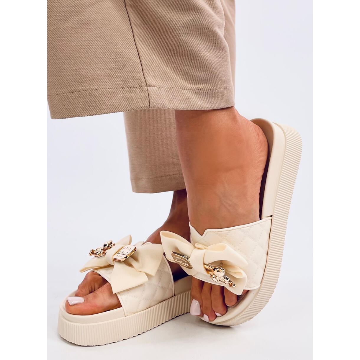 Va prezentam in oferta noastra un model inedit - Slapi cu ursuleti auriu. Aceasta este o propunere pentru toate femeile care apreciază combinația de eleganță, confort și detalii originale. Acești șlapi, într-o nuanță de bej subtil, vor fi o completare perfectă atât pentru seturile de zi cu zi, cât și pentru cele mai formale.