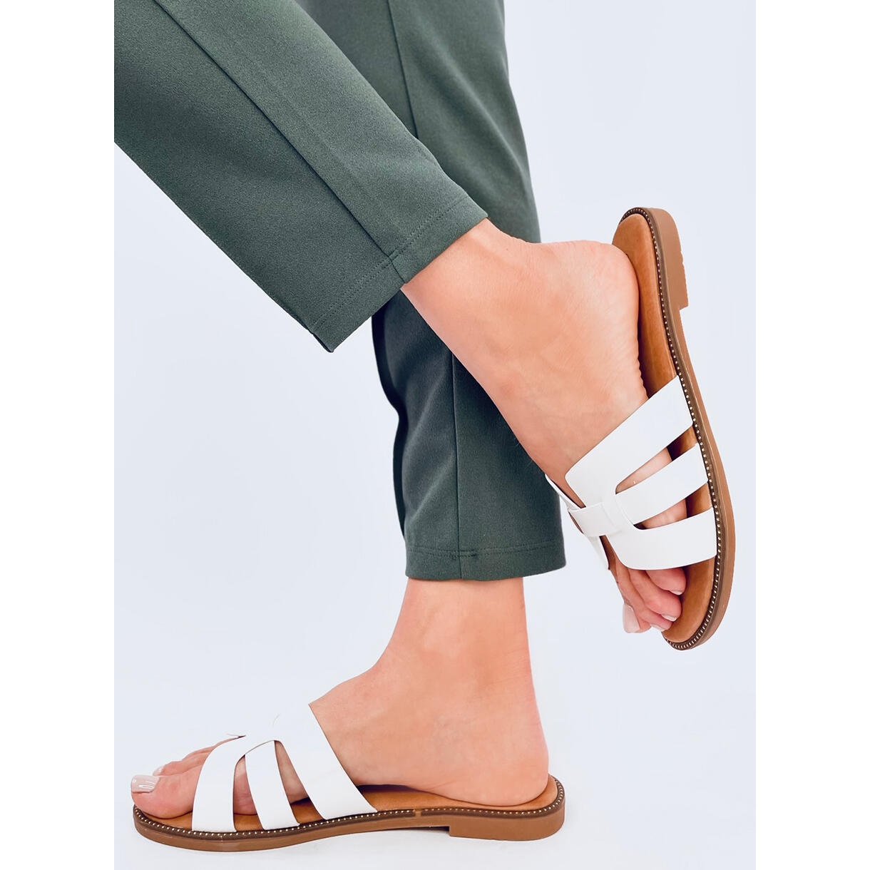 Slapii sunt așezați pe o talpă bej, plată, care le adaugă lejeritate și subtilitate. Această culoare a tălpii se potrivește perfect cu modelul alb, neted al pantofului, dând întregului aspect un aspect elegant. Un decor suplimentar sunt strasurile subtile care adaugă strălucire și ies în evidență față de designul clasic.
