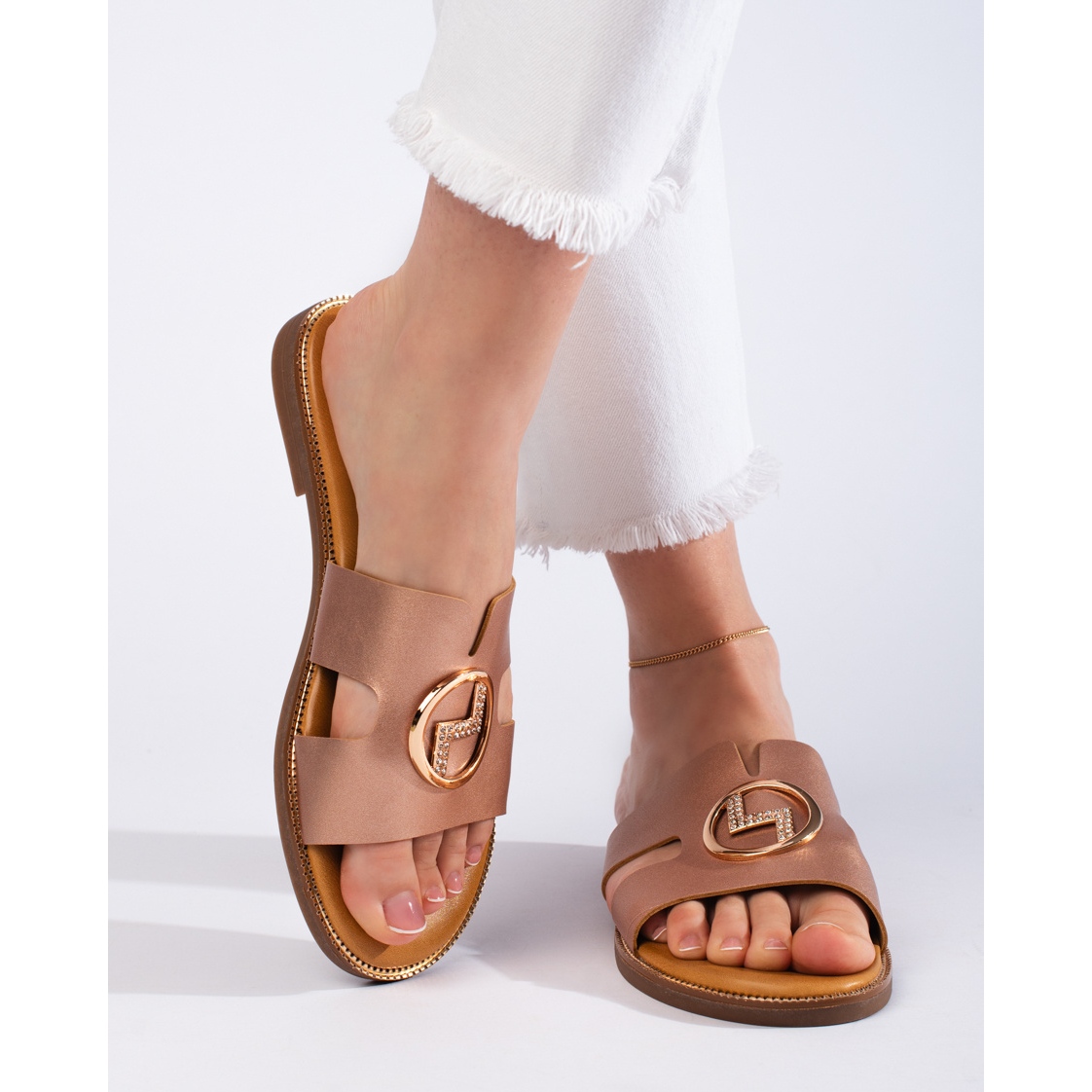 Acești șlapi plate de damă aurii sunt o alegere inteligentă pentru fiecare femeie care caută pantofi pentru zilele de primăvară și vară. Designul lor clasic, dar modern, le face ușor de asortat cu o varietate de stiluri - de la casual, urban la ieșiri mai formale, de seară.