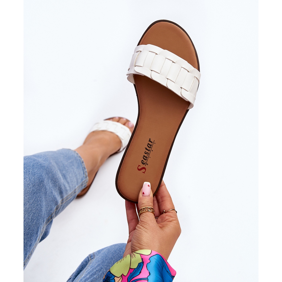 Aceste șlapi unice se caracterizează printr-un toc plat, care garantează confort chiar și atunci când sunt purtate pentru perioade lungi de timp. Datorită croiului lor clasic, se potrivesc cu aproape orice stil de vară, de la rochii largi, la pantaloni chino, la fuste vaporoase. Culoarea albă le face proaspete și ușor de combinat cu alte articole vestimentare, iar talpa bej le conferă un caracter subtil.