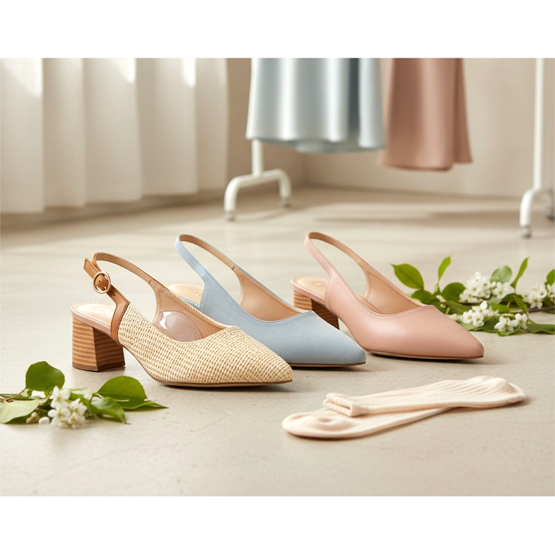 Dacă piciorul tău este subțire, alege un model cu călcâiul ușor înainte - acest lucru va împiedica alunecarea pantofului. Dacă ai picioare late, caută slingback-uri cu mai multă căptușeală la vârf și o curea mai elastică. Inserțiile cu gel de sub antepicior măresc semnificativ confortul la purtare, mai ales la tocuri mai înalte.