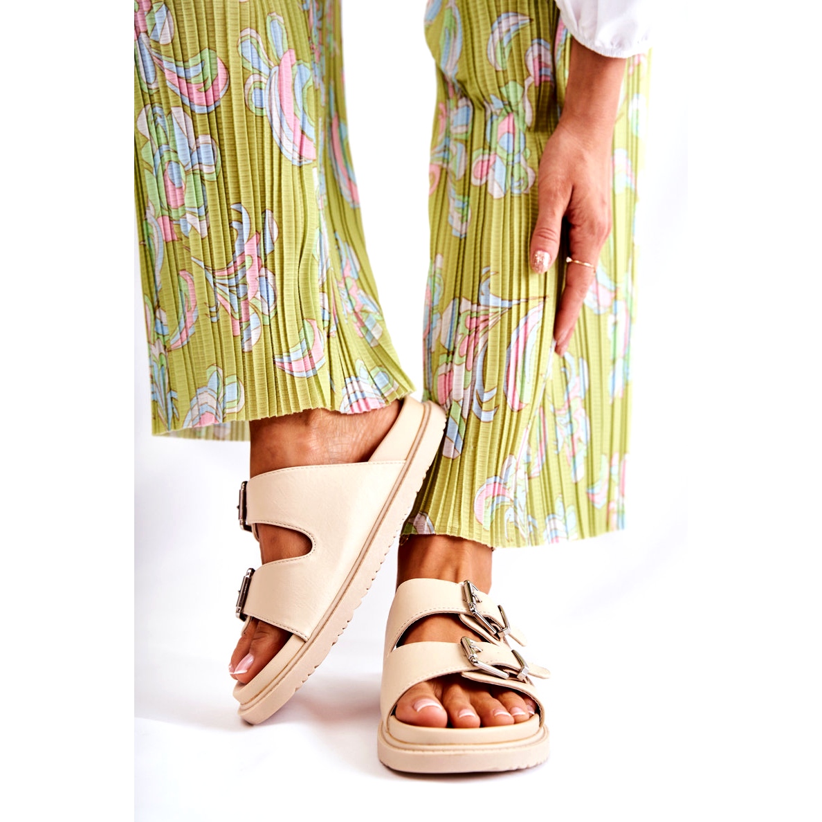Așezate pe o talpă plată, mai groasă, oferă confort pe parcursul multor ore de utilizare. Bretelele reglabile în față, finisate cu catarame, permit o potrivire perfectă la picior, ceea ce mărește confortul de utilizare. În plus, branțul din cauciuc profilat garantează susținerea picioarelor, ceea ce este deosebit de important în zilele călduroase.