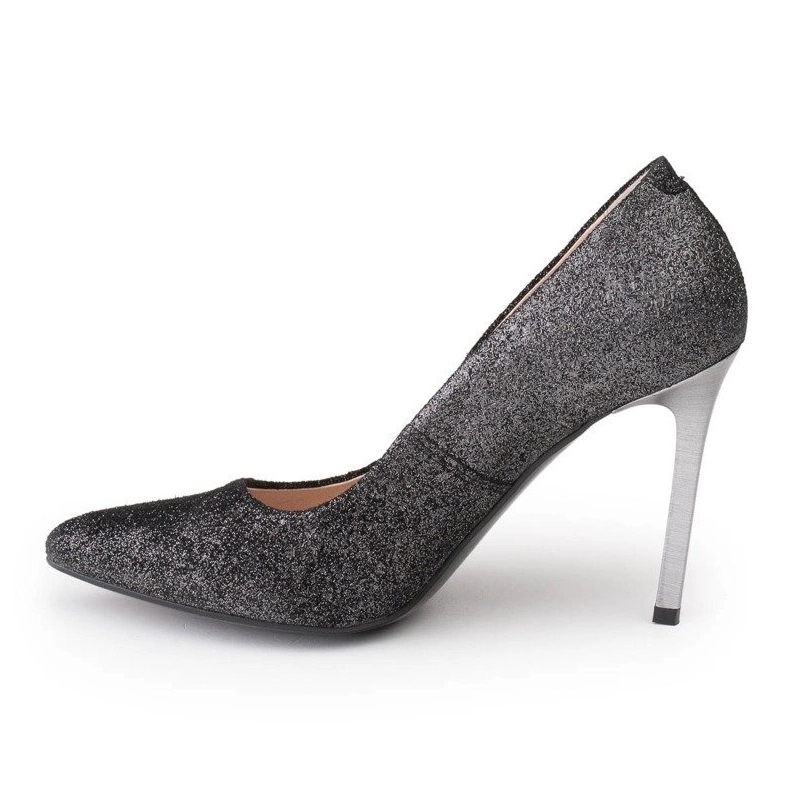 Pompele Marco Shoes sunt alegerea perfectă pentru femeile care caută eleganță și confort într-unul. Realizate din piele de vacă de înaltă calitate, într-o culoare neagră la modă, aceste tocuri înalte se remarcă printr-un finisaj cu sclipici care le conferă o strălucire unică. Degetul lor subțire, ascuțit, subliniază silueta feminină și face ca fiecare stil să fie expresiv.