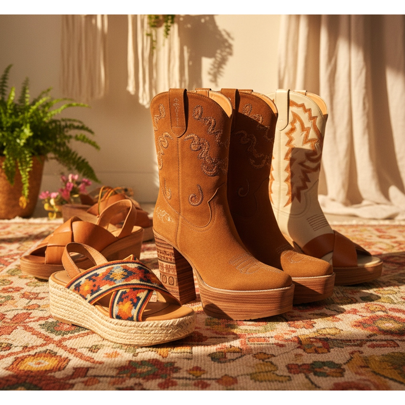 Cizmele de cowboy, adică ghetele inspirate de încălțămintea cowboy-ilor din Vestul Sălbatic, își au rădăcinile și în moda anilor 1970. Se caracterizează printr-un vârf ascuțit, toc înclinat și cusături decorative. Poartă-le cu blugi bootcut sau rochii boho lungi și fluide pentru un look autentic al epocii.