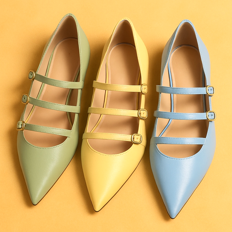 Balerinii nu părăsesc piedestalul, dar în 2026 își schimbă aspectul. Cele mai la modă modele vor fi cele cu vârful ascuțit, ascuțit, care prelungește optic picioarele. De asemenea, asistăm la o revenire grozavă a dungilor - balerinii în stil Mary Jane, cu două sau chiar trei dungi pe copt, sunt absolut obligatorii. Culori? Pasteluri dulci: fistic, albastru baby și galben unt.