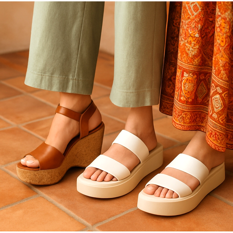 Dacă îți plac tocurile, avem o veste bună: au revenit panele și platformele confortabile, dar într-o versiune mai ușoară. Sandalele cu talpă din plută în stilul anilor 1970 și șlapii cu formă plată vor domina stilul urban. Sunt stabile, adaugă centimetri și se potrivesc perfect cu pantaloni palazzo largi la modă și rochii maxi în stil boho.