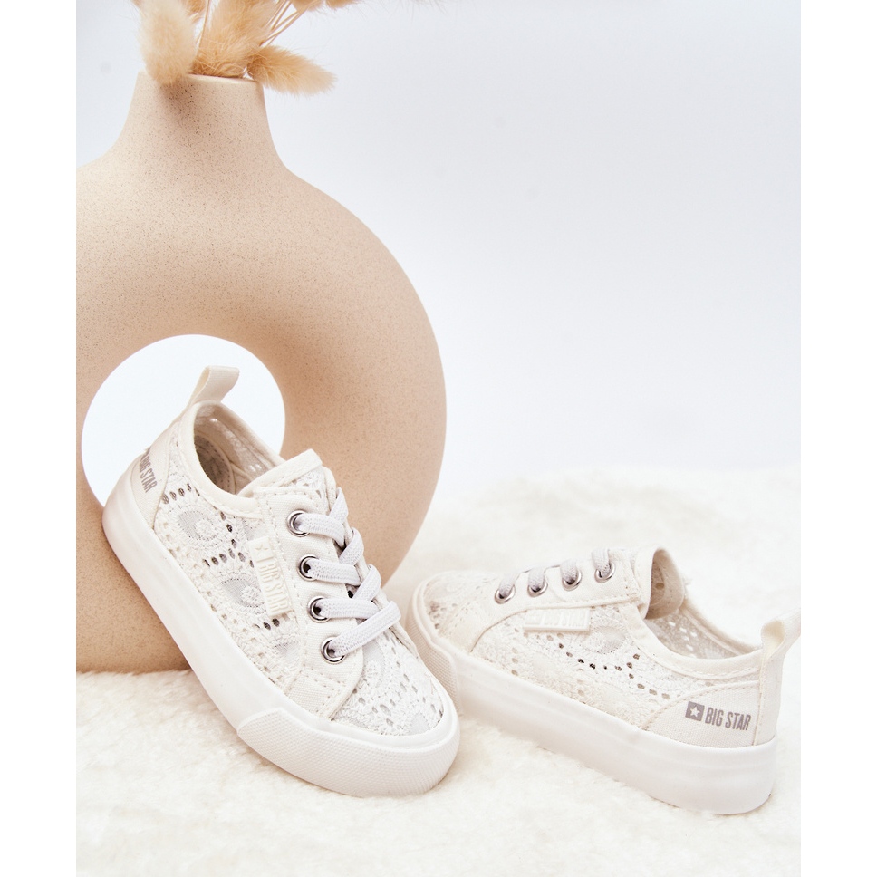 Star Big Star JJ374134 Openwork Adidatori - adidași albi, ușori și confortabili pentru fete, perfecte pentru zile mai calde. Fabricate din țesătură respirabilă cu un model de lucru deschis, acestea asigură o bună circulație a aerului și o lejeritate a purtării. Model alunecat, cu elastice imitând șireturi, ceea ce face mai ușor să se pună și să se potrivească pantofului. Inserare de materiale moi și talpă de cauciuc non -alunecare garantează confortul și siguranța în fiecare zi.