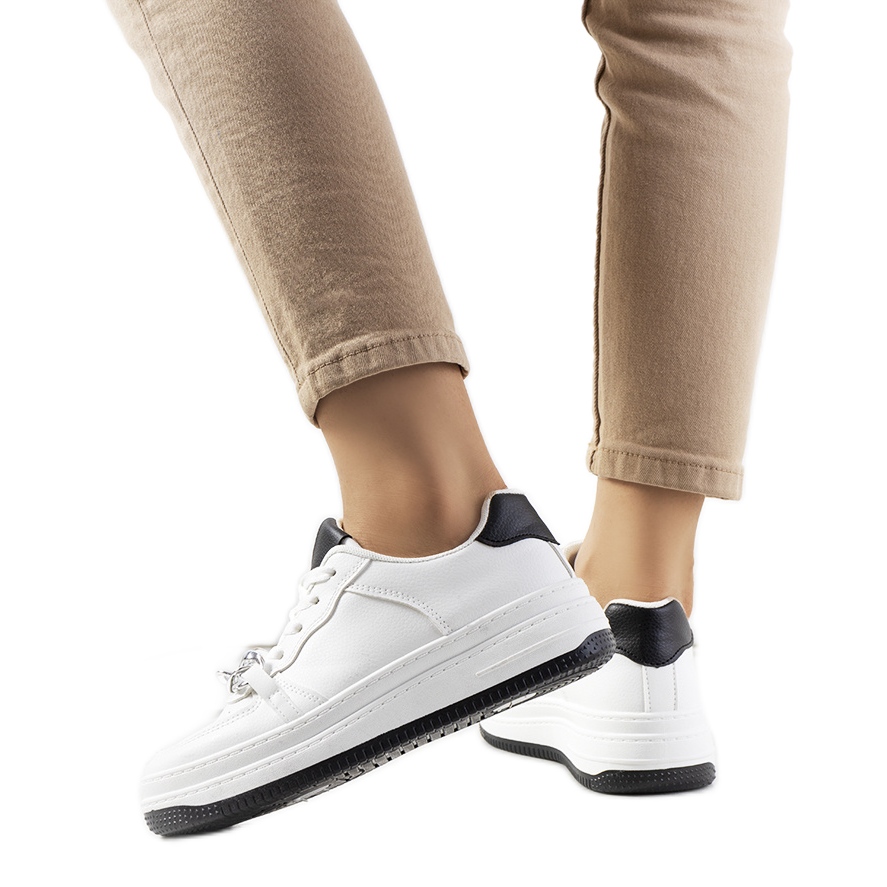 Sneakers elegante, albe, Mary este o propunere ideală pentru vară - combină o talpă la modă, ridicată, cu o tăietură clasică scăzută. Fabricat din piele ecologică de înaltă calitate, cu un lanț decorativ care le oferă caracter și îi face un accent distinctiv al fiecărei stilizări.