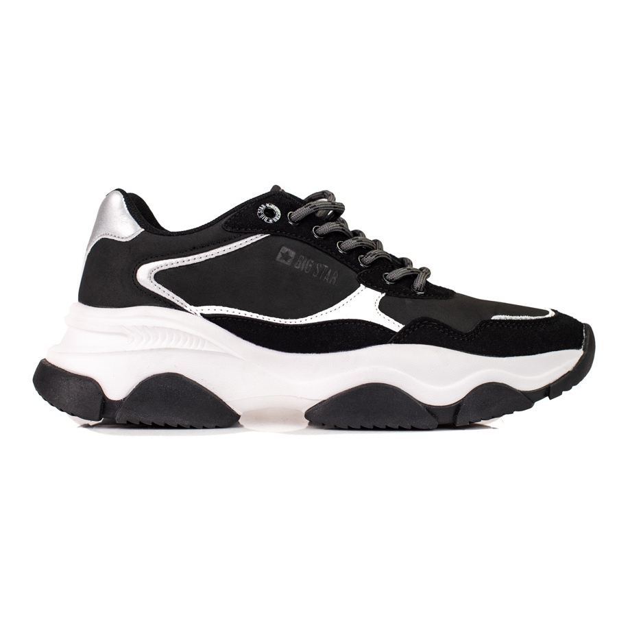 Adidași eleganți Big Star KK274383 în Universal Black Combină un personaj sportiv cu design la modă. Fabricat din piele de imitație și țesătură, cu o talpă textilă și un finisaj intern, asigură confortul toată ziua. O talpă de cauciuc cu o benzi de rulare garantează o aderență bună, iar platforma înaltă de 4 cm ridică subtil cifra, fără a renunța la confortul încălțămintei joase.