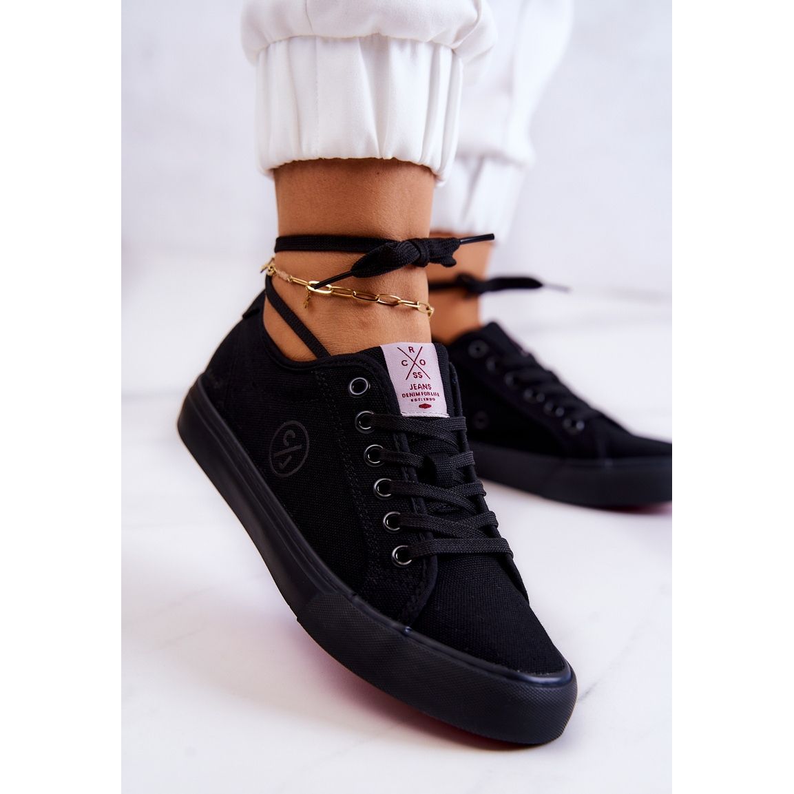 Sneakers pentru femei Cross Cross JJ2R4049C - clasic într -o ediție casual. Modelul negru, material, pe o platformă delicată, de 2 cm, combină confortul cu eleganța supusă, ideală pentru stilizări de zi cu zi - de la blugi la rochii de vară.