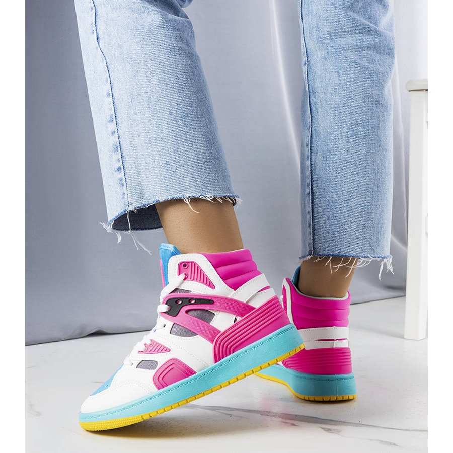 - Culoare: alb cu fucsia și accente albastre (alb/albastru/roz), talpă galbenă