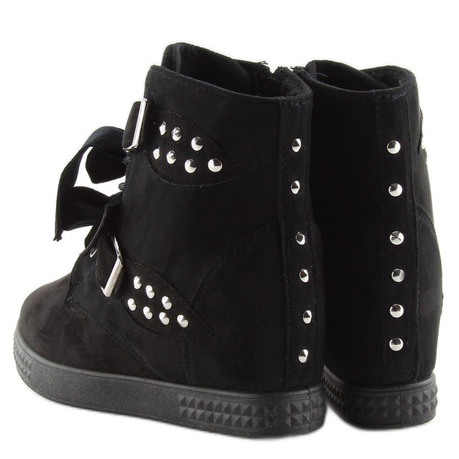 Vă prezentăm frumoși adidași de damă A-79 în negru, care sunt o combinație perfectă de stil și confort. Acești adidași unici cu pană ascunsă, de 7 cm înălțime, atrag atenția prin designul lor original. Finisajul din piele intoarsa neagra si crampoanele decorative argintii adauga caracter, in timp ce fundite de catifea adauga o nota de eleganta.