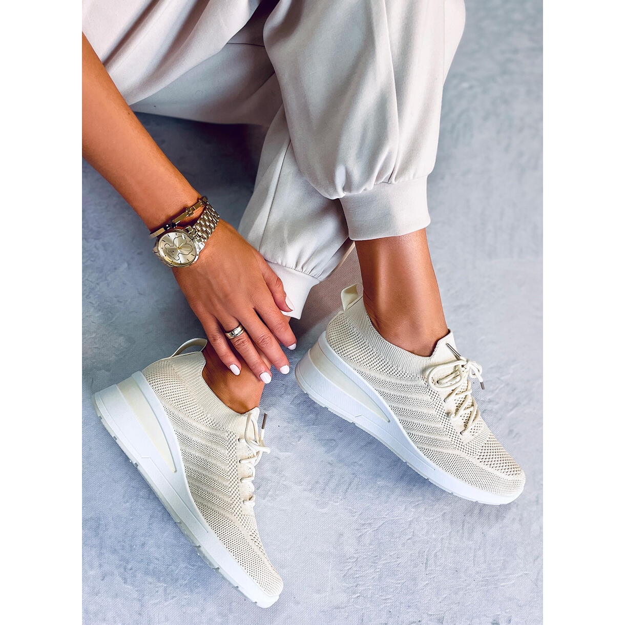 - Culoarea bej a pantofilor sport este universala si se va potrivi cu multe stiluri, pastrand totodata un ton elegant.