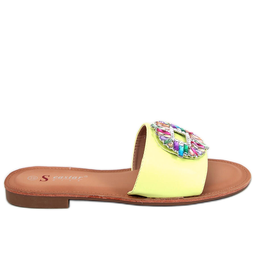 Descoperă extraordinarii șlapi de damă BM Lowell Green care vor adăuga un pic de culoare stilului tău de zi cu zi! Acești șlapi eleganti cu talpă plată impresionează cu o curea largă, decorată cu pietre colorate și strălucitoare care atrag atenția și adaugă o strălucire unică oricărui stil.