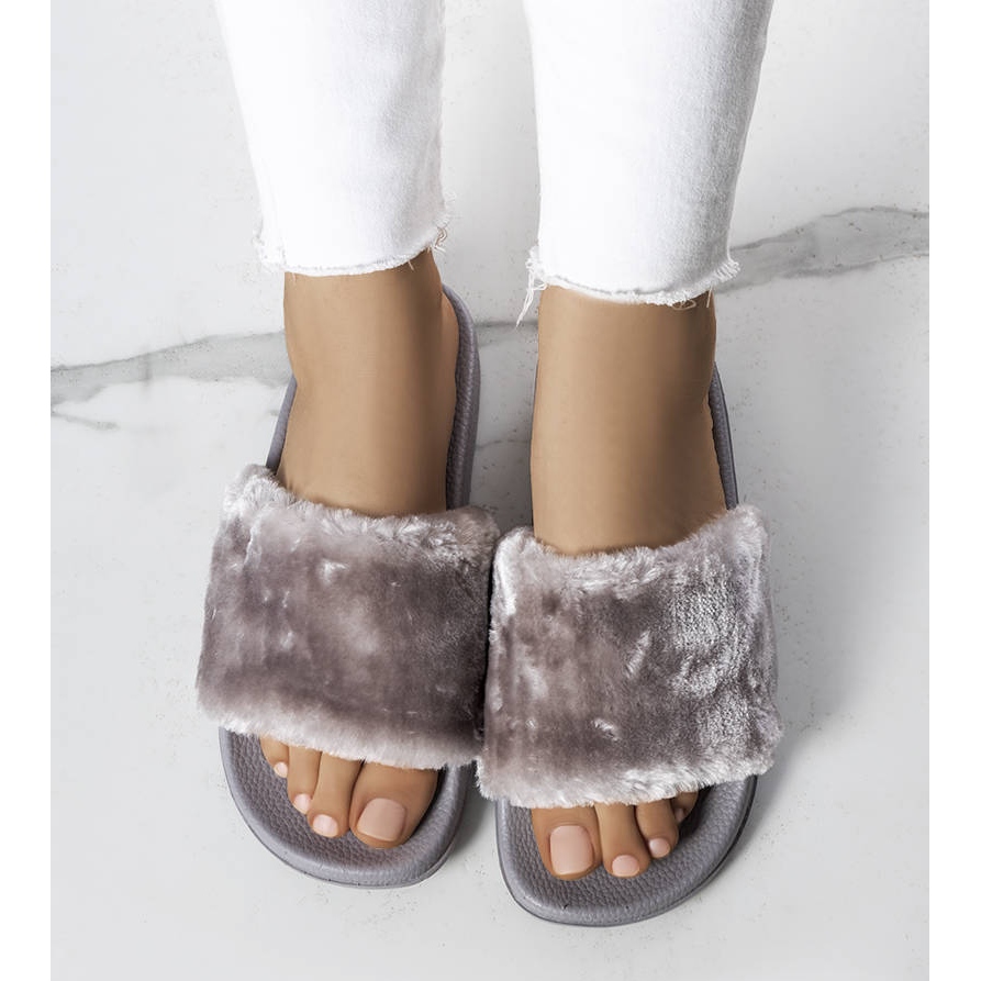 Culoarea gri clasică a șlapilor se potrivește bine cu diverse stiluri, iar talpa uniformă în aceeași nuanță creează un întreg coerent. O centură largă acoperită cu blană imitație adaugă farmec și un caracter unic. În plus, o ușoară profilare a degetelor de la picioare face ca șlapii să se potrivească perfect cu forma piciorului.