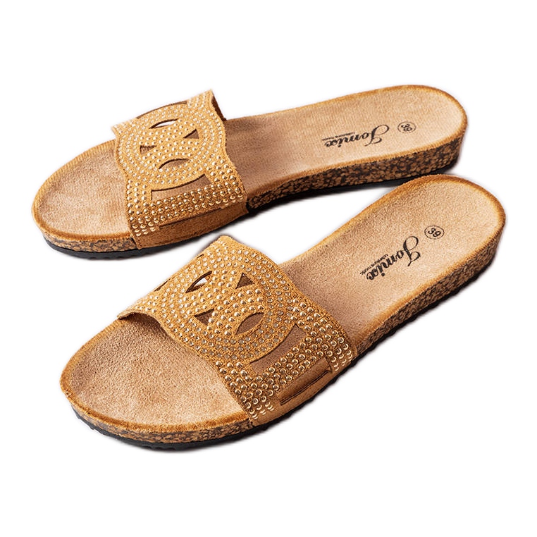 Elegant, papuci pentru femei caramel din colecția de vară, decorate cu zirconi strălucitori și strasuri. Încălțăminte alunecată, casual scăzută, perfectă zilnic - o inserție ecologică confortabilă din piele și o talpă de cauciuc durabilă.