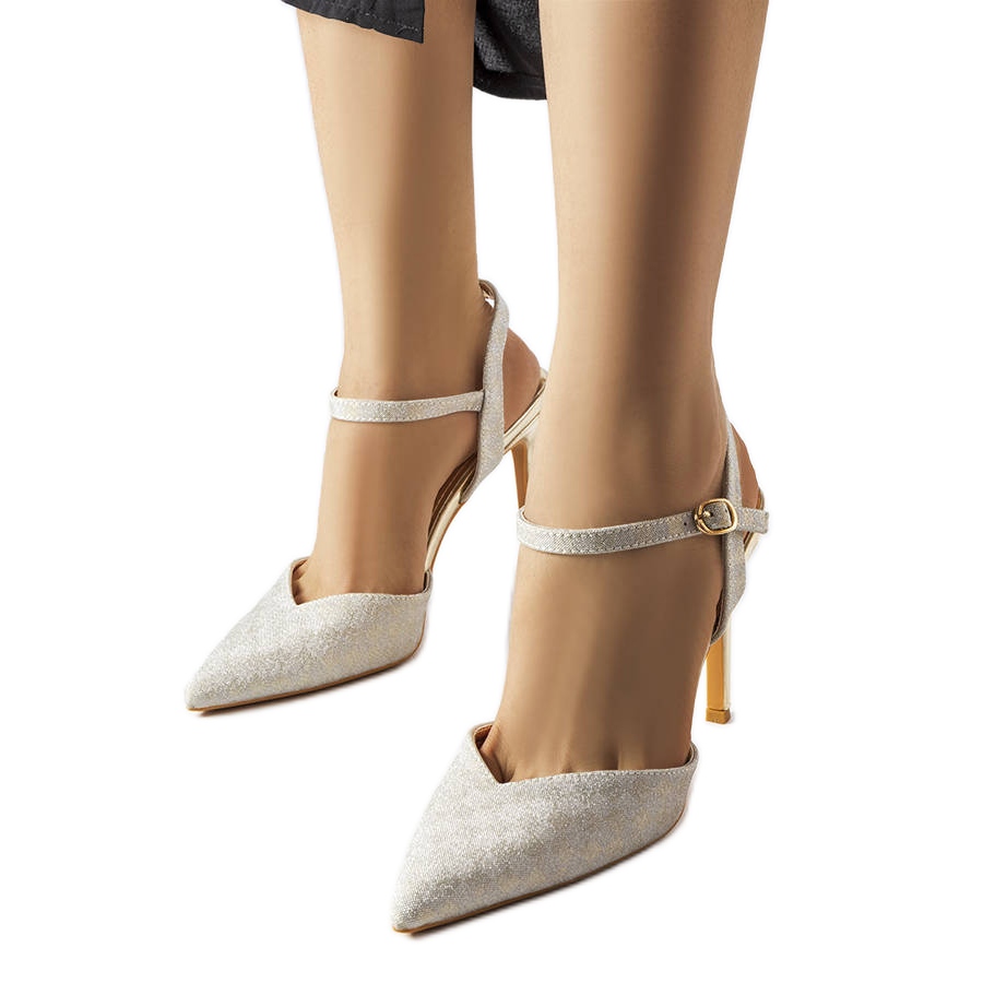 Fenomenal, tocuri înalte pentru femei de aur, cu un nas clasic, ascuțit și un călcâi îngust (11 cm). Țesătura metalică cu un efect delicat, strălucitor al „Chessboard” adaugă stil, iar catarama reglabilă asigură o potrivire mai bună. Perfect pentru ieșiri de seară, nunți și evenimente de vară.