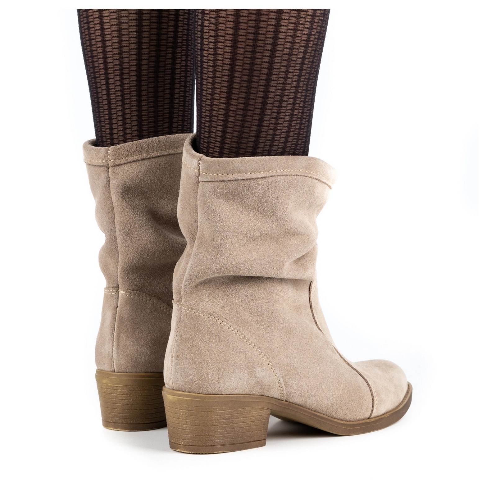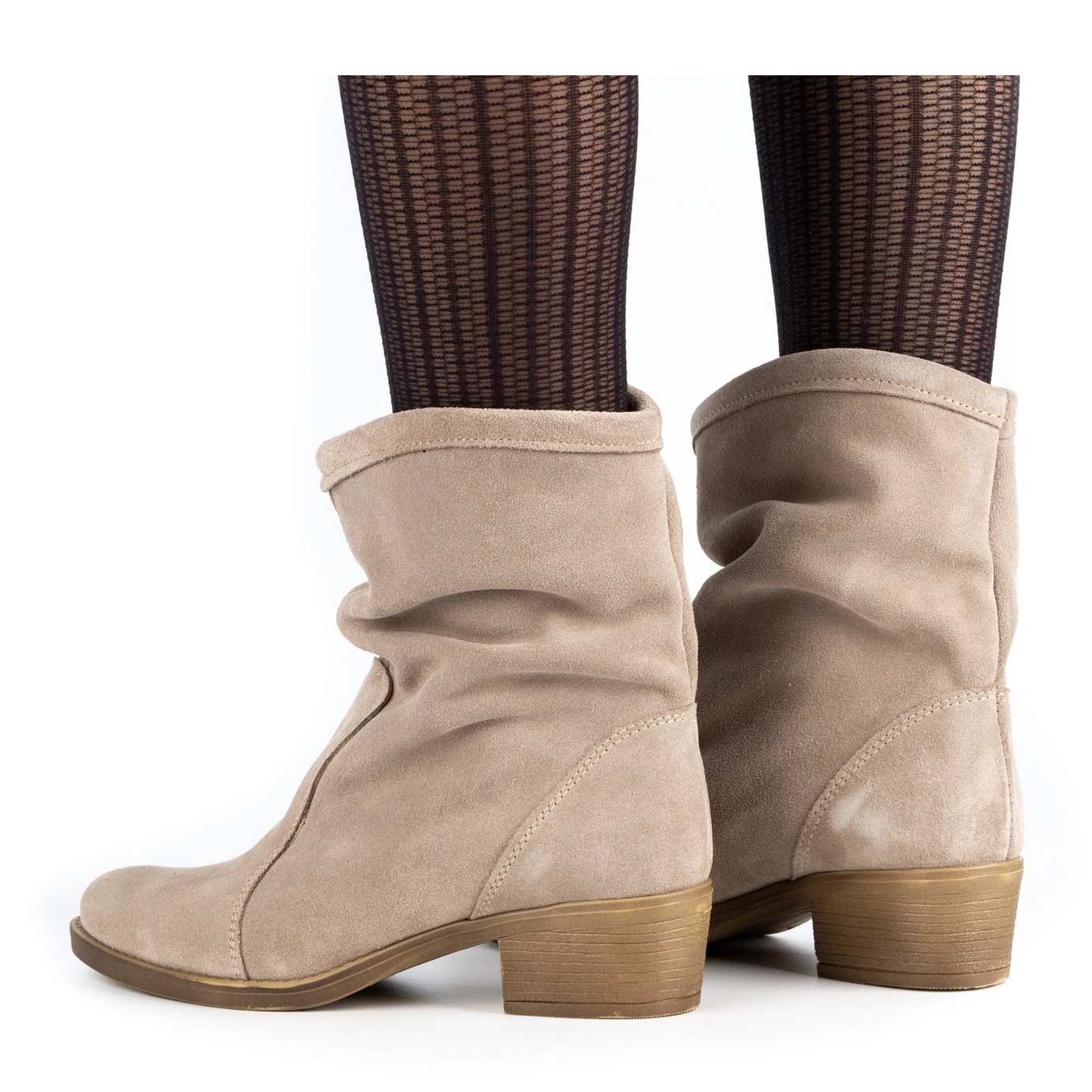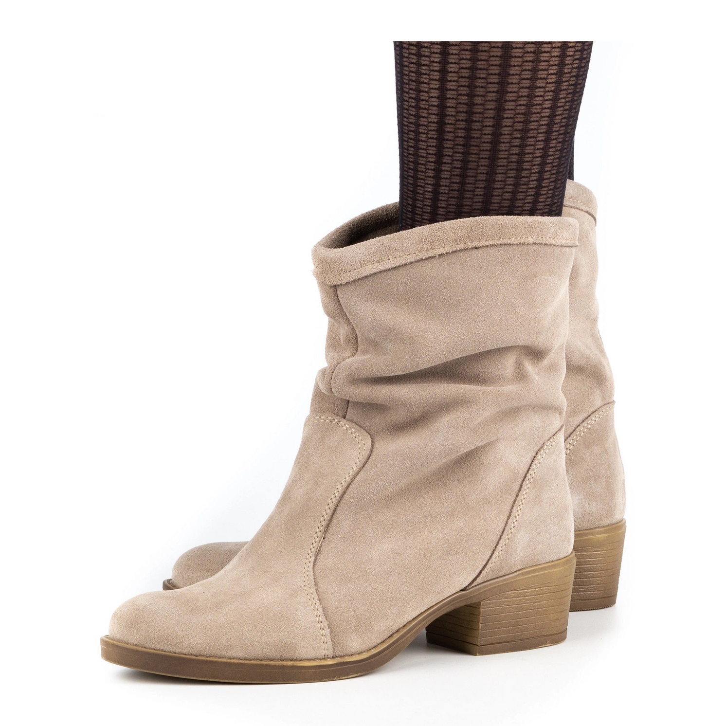 La exterior, cizmele sunt confectionate din piele naturala sub forma de nubuc moale, care le confera un aspect elegant. Înălțimea tocului este de 4,5 centimetri, ceea ce subțiază optic silueta și adaugă grație. Botinele sunt disponibile intr-o culoare bej care se combina usor cu diverse tinute. Arată cel mai bine atunci când sunt combinate cu rochii și fuste.