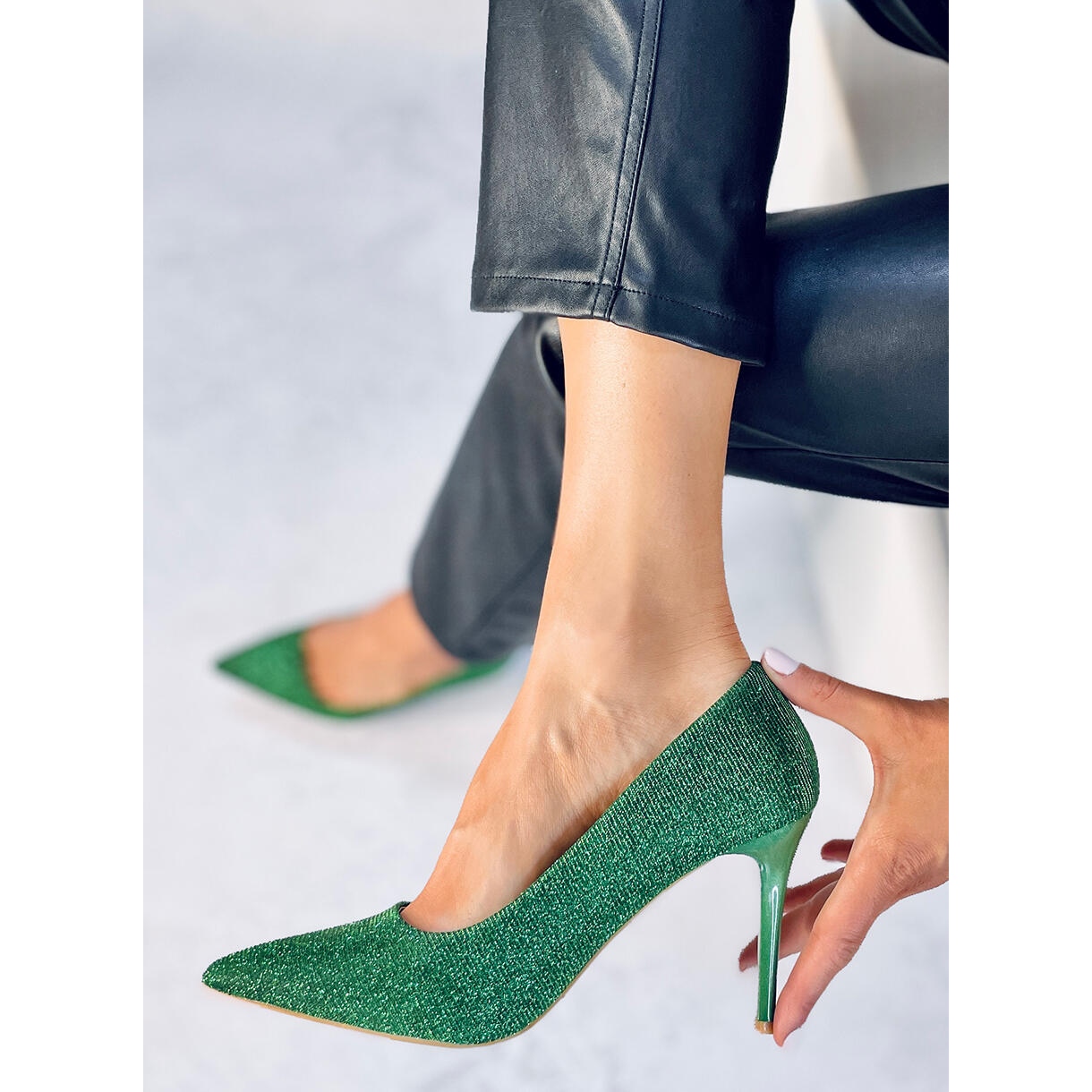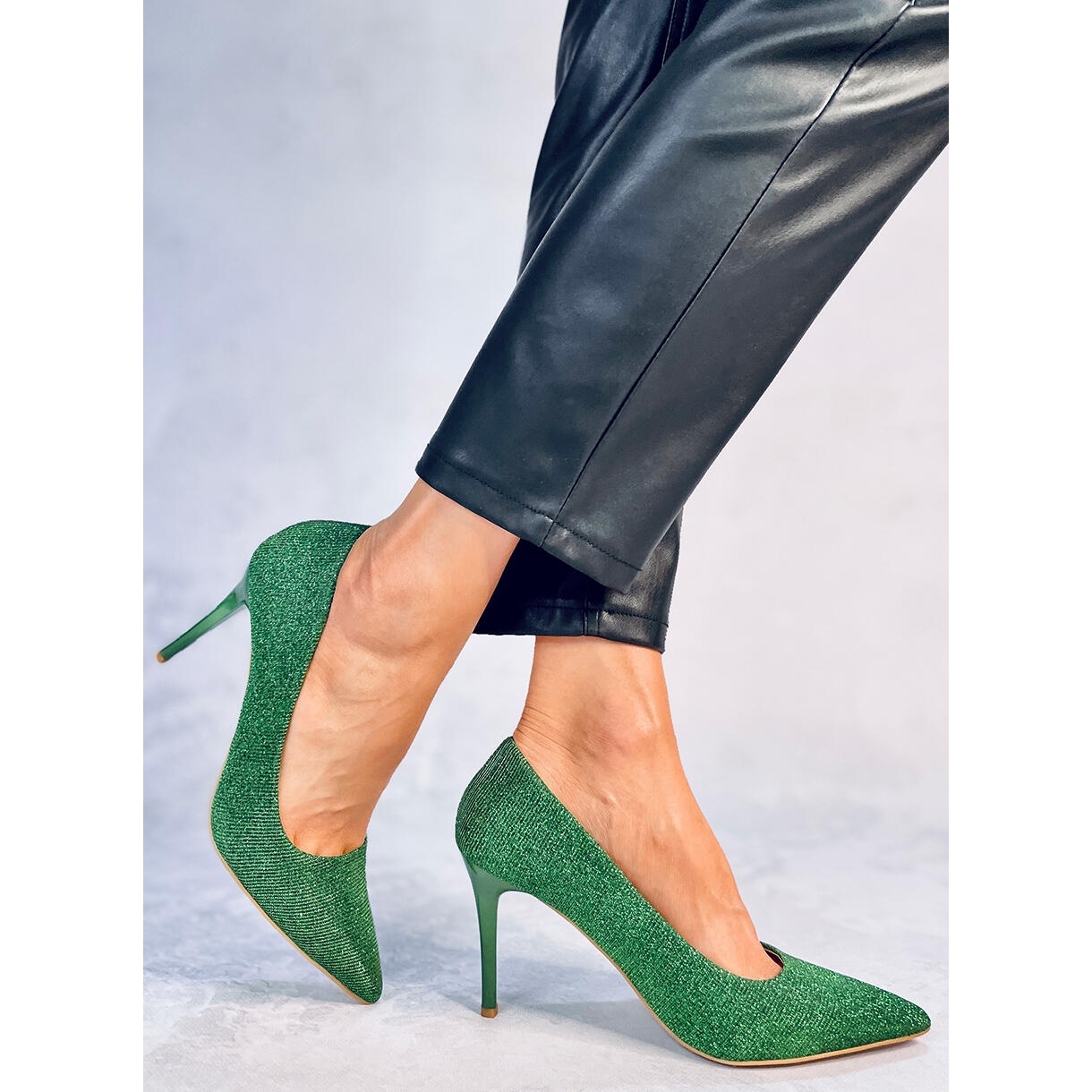 Designul acestor tocuri înalte atrage privirea datorită efectului irizat, unde materialul strălucește ușor în diferite nuanțe de verde în funcție de lumina incidentă. Aceasta este alegerea perfectă pentru femeile care doresc să adauge un pic de magie look-ului lor.