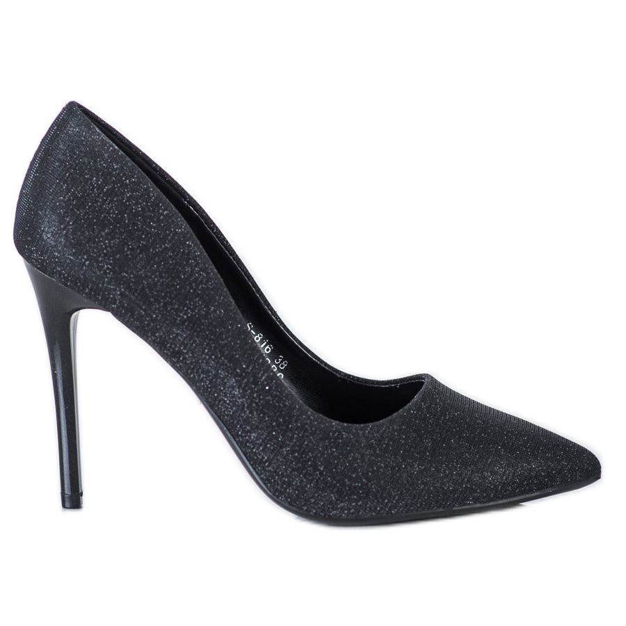 Tocurile înalte negre cu sclipici au un vârf ascuțit, ceea ce este caracteristic celor mai la modă stiluri din lumea modei. Practicitatea este asigurată de faptul că acestea sunt modele slip-on, ceea ce facilitează încălțarea și scoaterea rapidă a pantofilor.