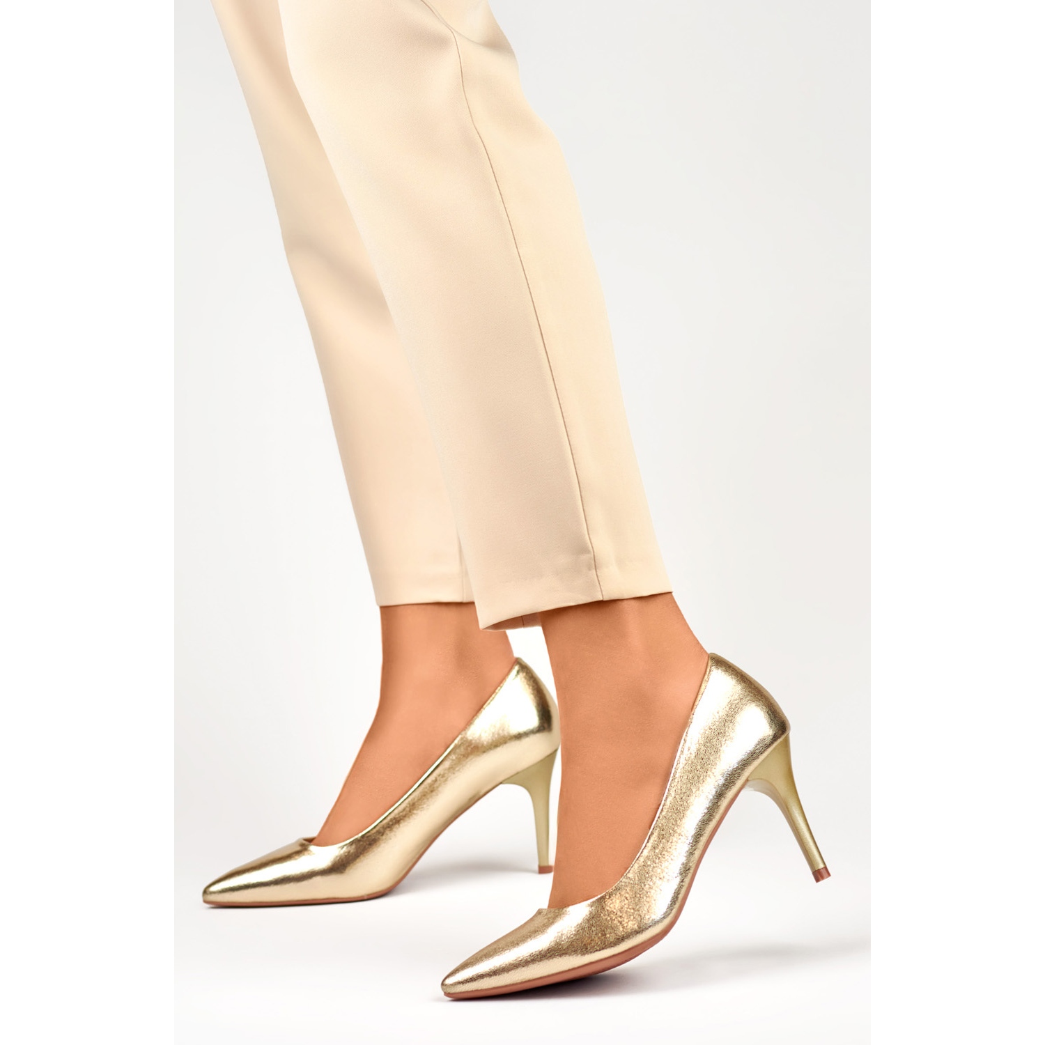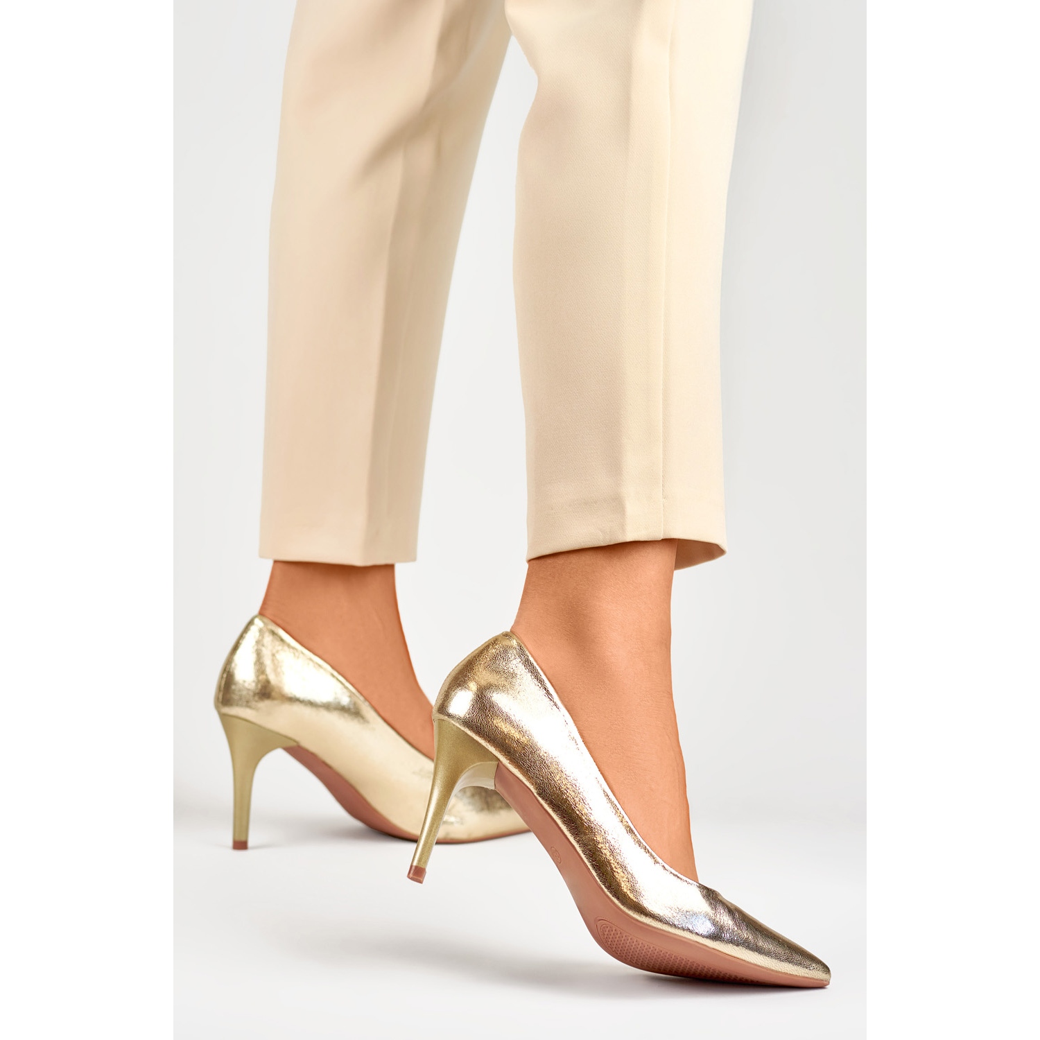 Tocurile sunt de culoare aurie, uniforme pe toată suprafața, fără niciun model dominant, ceea ce le face un plus universal pentru multe stiluri. Talpa este sintetică, iar branțul este din piele naturală, ceea ce asigură confort la purtare.