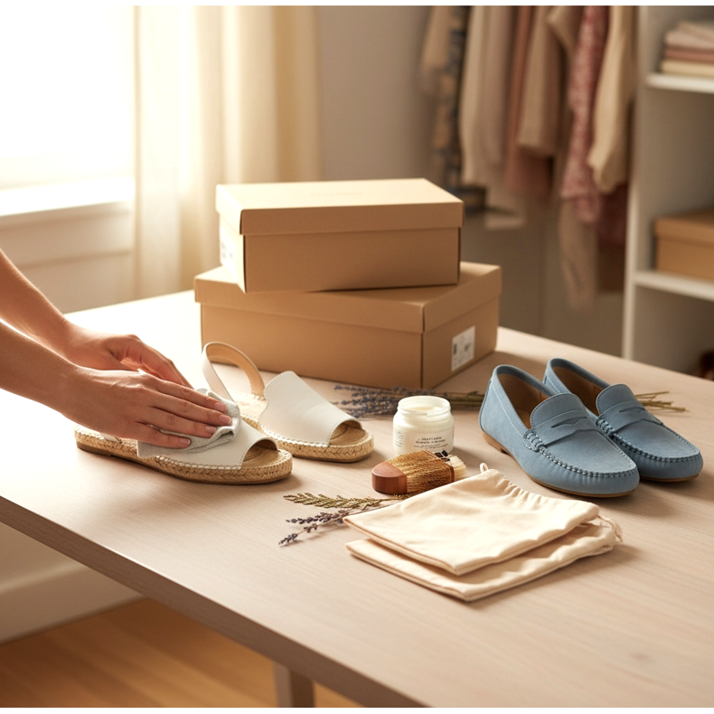Înainte de a-ți depozita pantofii de vară pentru sezon, asigură-te că sunt curați și uscati. Orice urmă de murdărie sau transpirație poate duce la pete sau mirosuri permanente. Ștergeți-le cu o cârpă curată și lăsați-le să se usuce complet. Daca pantofii tai sunt piele intoarsa sau piele, aplica o lotiune de protectie. Nu uitați să le depozitați într-un loc răcoros și uscat - niciodată în lumina puternică a soarelui, care poate decolora pantofii. Dacă puteți, depozitați-le în cutii sau pungi de pânză pentru a le proteja de praf.
