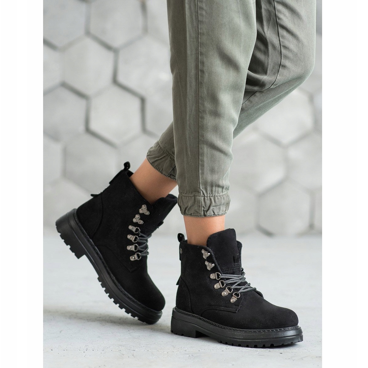Trappers cu șireturi SHELOVET în negru sunt o alegere ideală pentru femeile care apreciază confortul și stilul în zilele mai reci. Acești pantofi extrem de funcționali vor fi o alegere perfectă pentru toamnă și iarnă, oferind confort termic datorită izolației.