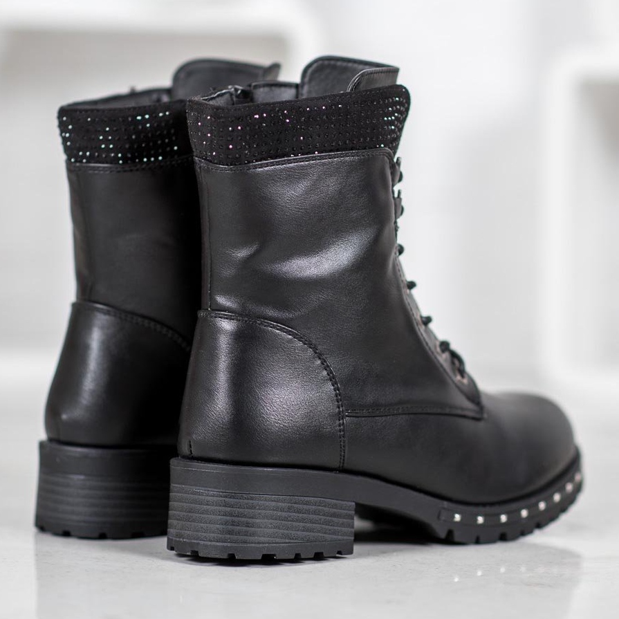 Partea superioară de 16 cm înălțime protejează eficient împotriva condițiilor meteorologice nefavorabile, iar vârful rotund adaugă subtilitate. O talpă sintetică înaltă și plată, de 2 cm grosime, asigură stabilitate și confort la fiecare pas. În plus, strasurile și știfturile de pe partea de sus sunt un accent elegant care conferă pantofilor un caracter rock.