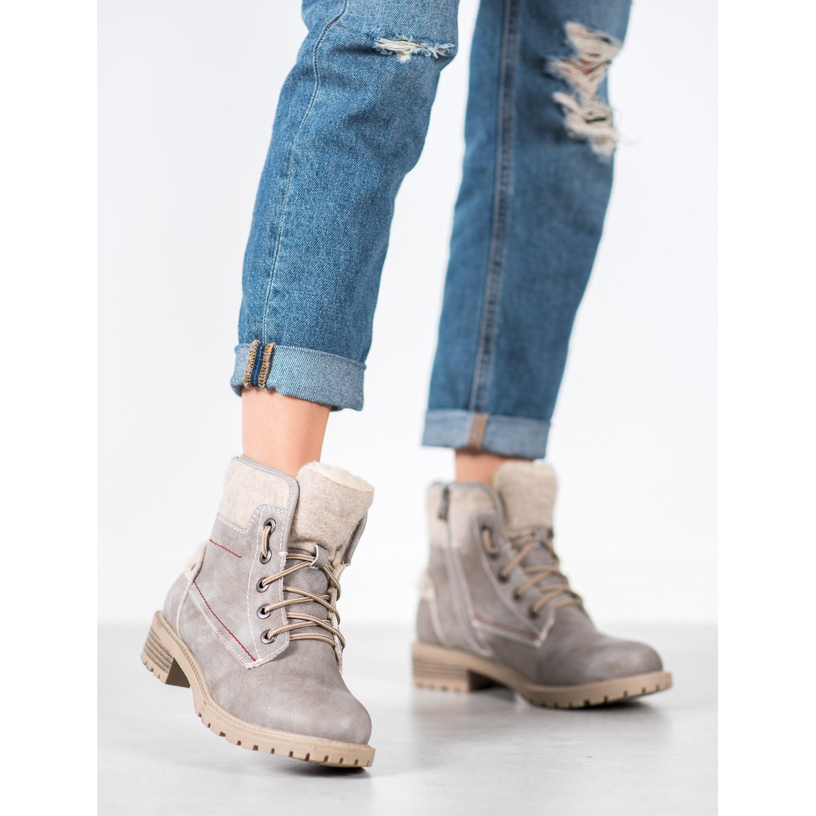 Acești pantofi sunt echipați cu șireturi practice și fermoar, ceea ce îi face ușor de pus și scos. Talpa călcată asigură stabilitate și o bună aderență la sol, ceea ce este deosebit de important pe vremea de toamnă și iarnă.