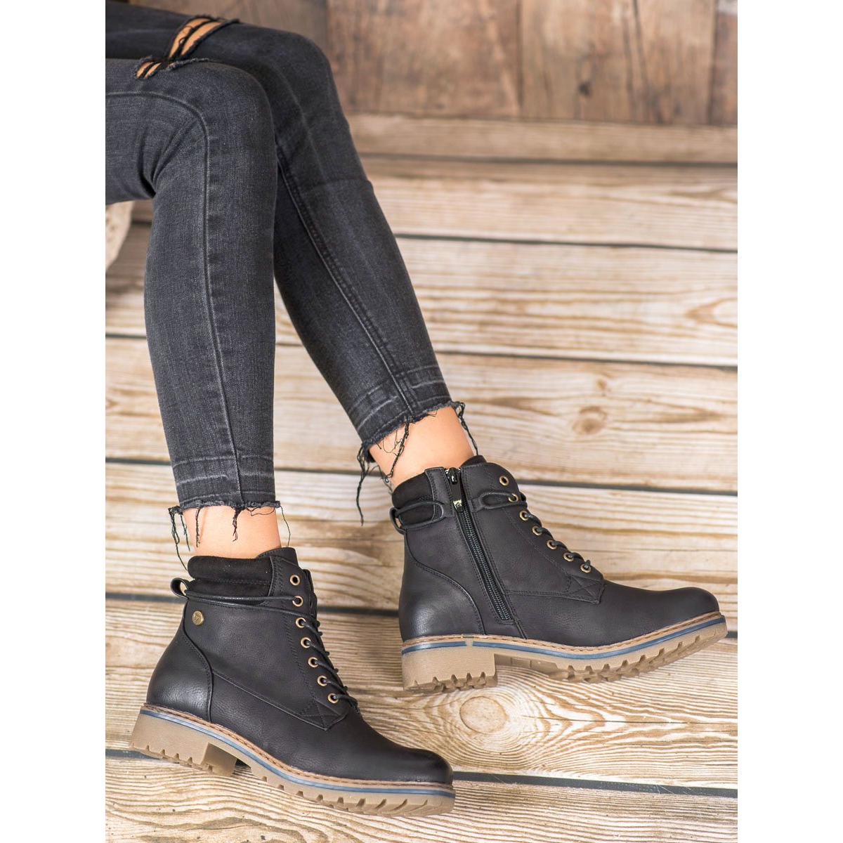 Adidașii negri se remarcă printr-un toc lat de 4 cm înalt, care garantează confort în timpul activităților de zi cu zi. Șireturile în față și fermoarul în interior fac pantofii mai ușor de pus și scos și, în același timp, le adaugă caracter. Varful rotund si tocul incorporat fac pantofii confortabili si ofera suport stabil piciorului.