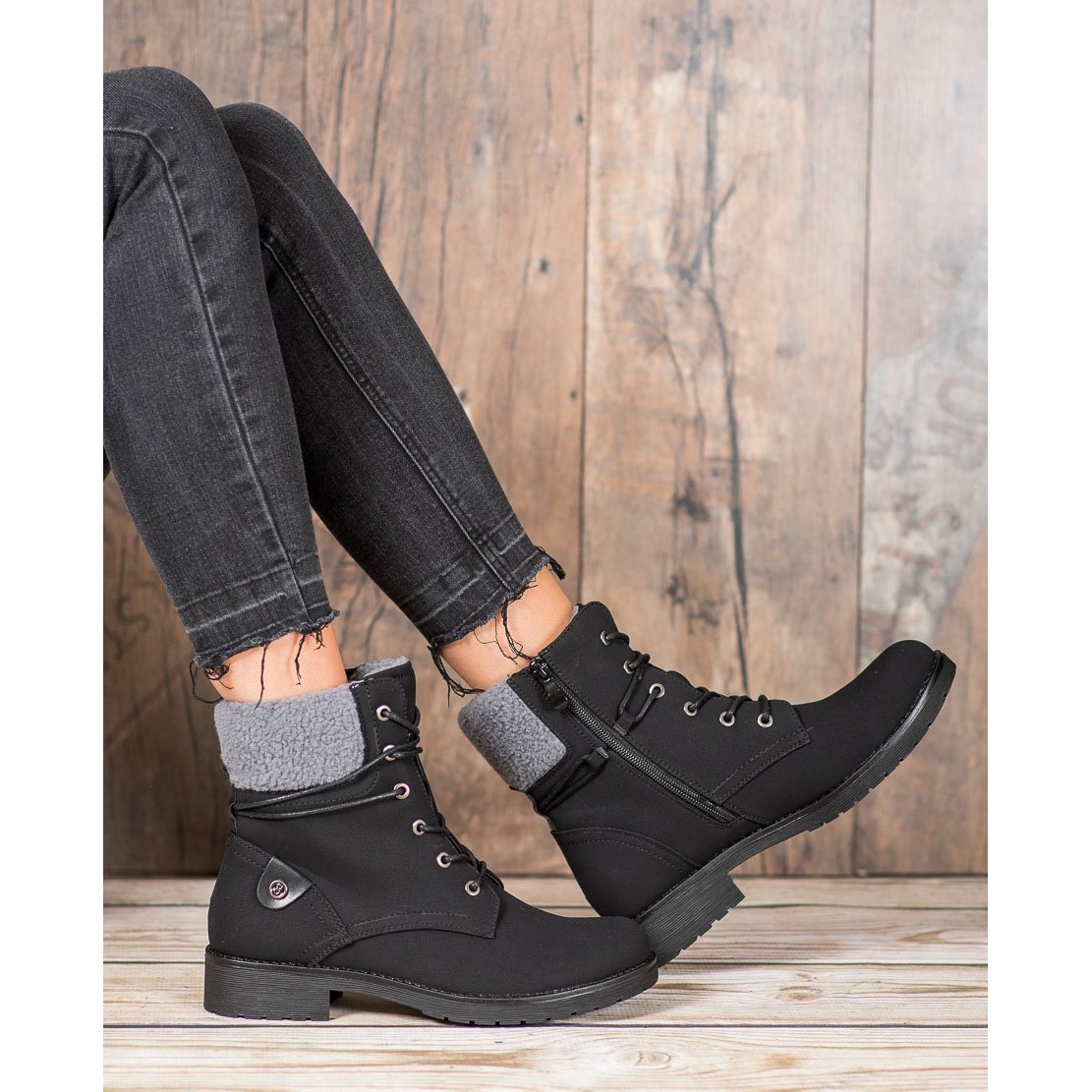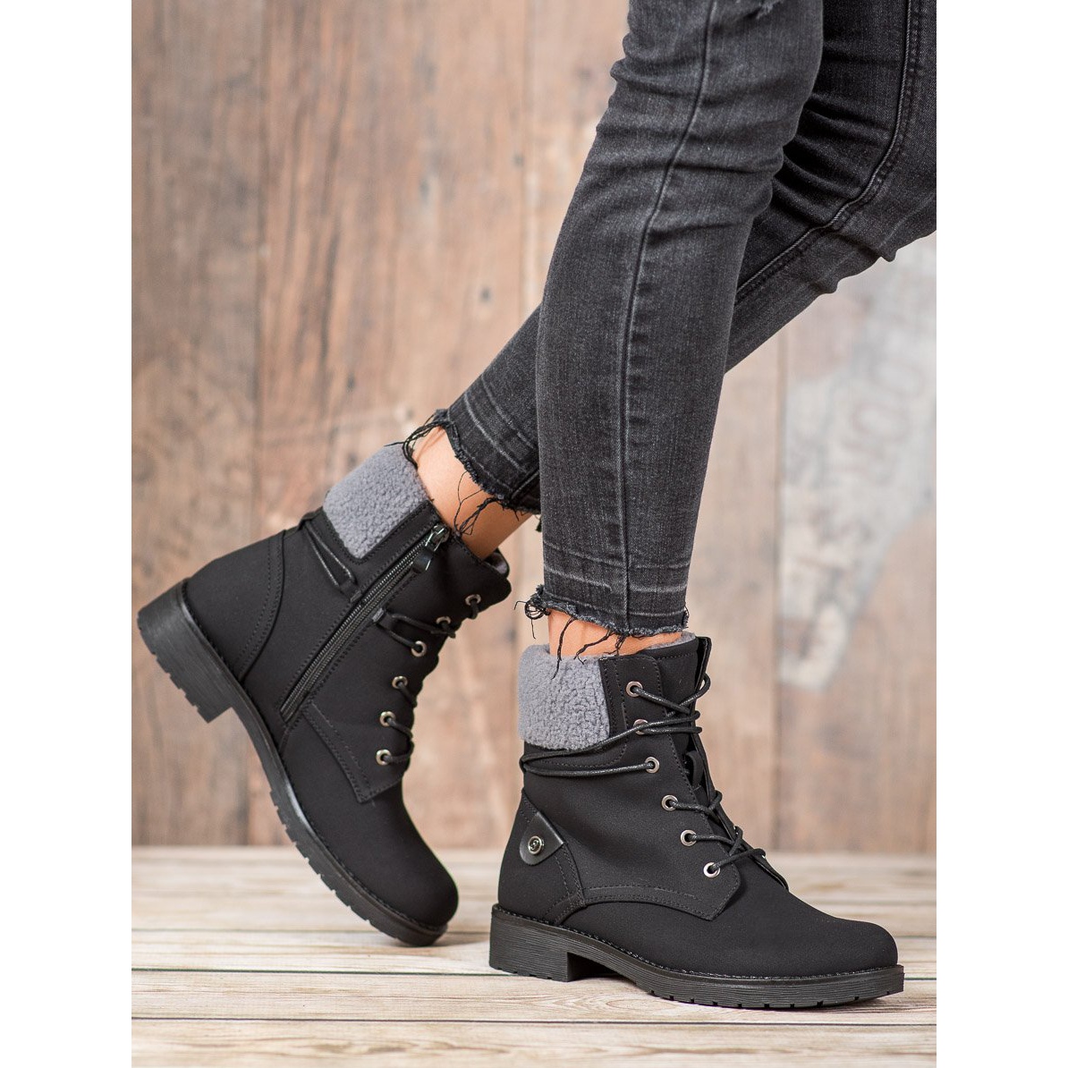 Partea superioară a pantofilor ajunge deasupra gleznei, ceea ce îi face nu numai stilați, ci și protejează picioarele împotriva condițiilor meteorologice nefavorabile, perfecte pentru zilele de toamnă și iarnă. Închiderea cu dantelă și fermoar îl face ușor de pus, iar călcâiul rigid stabilizează în plus piciorul.