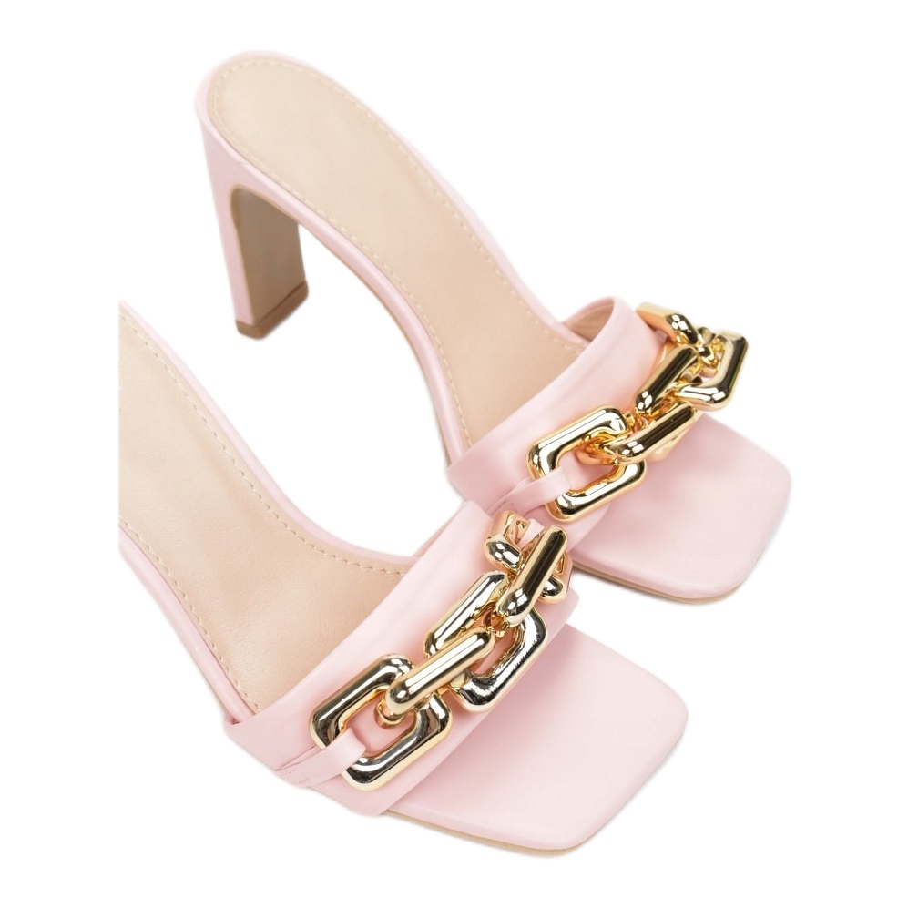 Acest model se remarcă printr-un deget pătrat și o curea largă între degete și balonul piciorului, care este decorată cu un lanț de aur elegant. Detaliile suplimentare, cum ar fi strasurile, le dau un caracter unic si le fac perfecte pentru stilul de zi cu zi si pentru ocazii speciale.