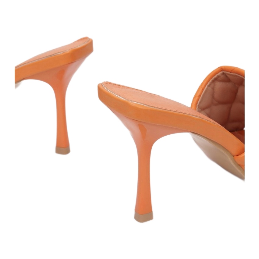 Acești șlapi unici se remarcă printr-un toc înalt, subțire, de 8 cm, care le conferă un caracter feminin și cu siguranță va atrage atenția. Materialul exterior și inserția sunt din piele ecologică, ceea ce le face nu numai la modă, ci și ecologice. Talpa sintetică asigură aderență adecvată și confort la purtare.