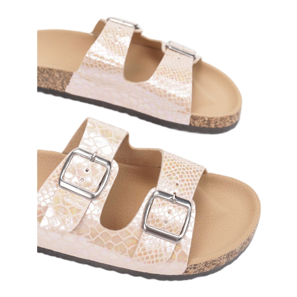 Șlapii Vices CM-2077-449-șampanie aurii sunt o alegere extrem de stilată pentru femeile care apreciază confortul și aspectul la modă. Fabricate din piele ecologică de înaltă calitate, care imită pielea elegantă de crocodil, se încadrează perfect în tendințele actuale. Bretele largi cu catarame în față nu numai că adaugă caracter, dar asigură și stabilitate și confort la purtare.