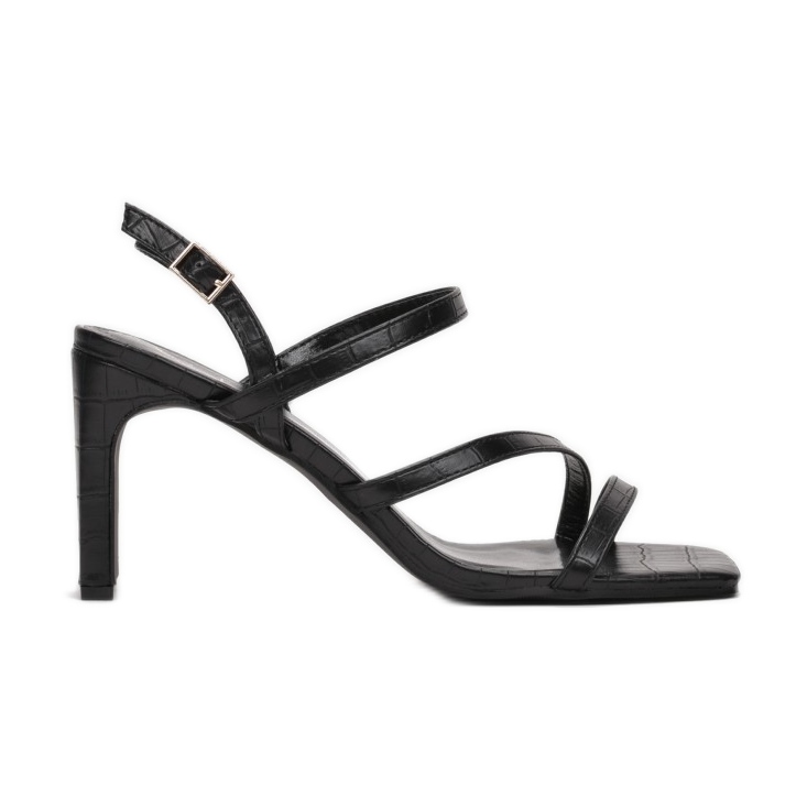 Un stâlp înalt cu o înălțime de 8 cm adaugă siluetei subțiri și în același timp garantează stabilitate în timpul mersului. Închiderea cu cataramă ușurează încălțarea și ajustarea pantofilor la picior. Sandalele nu au deget, ceea ce le confera lejeritate si un caracter modern.