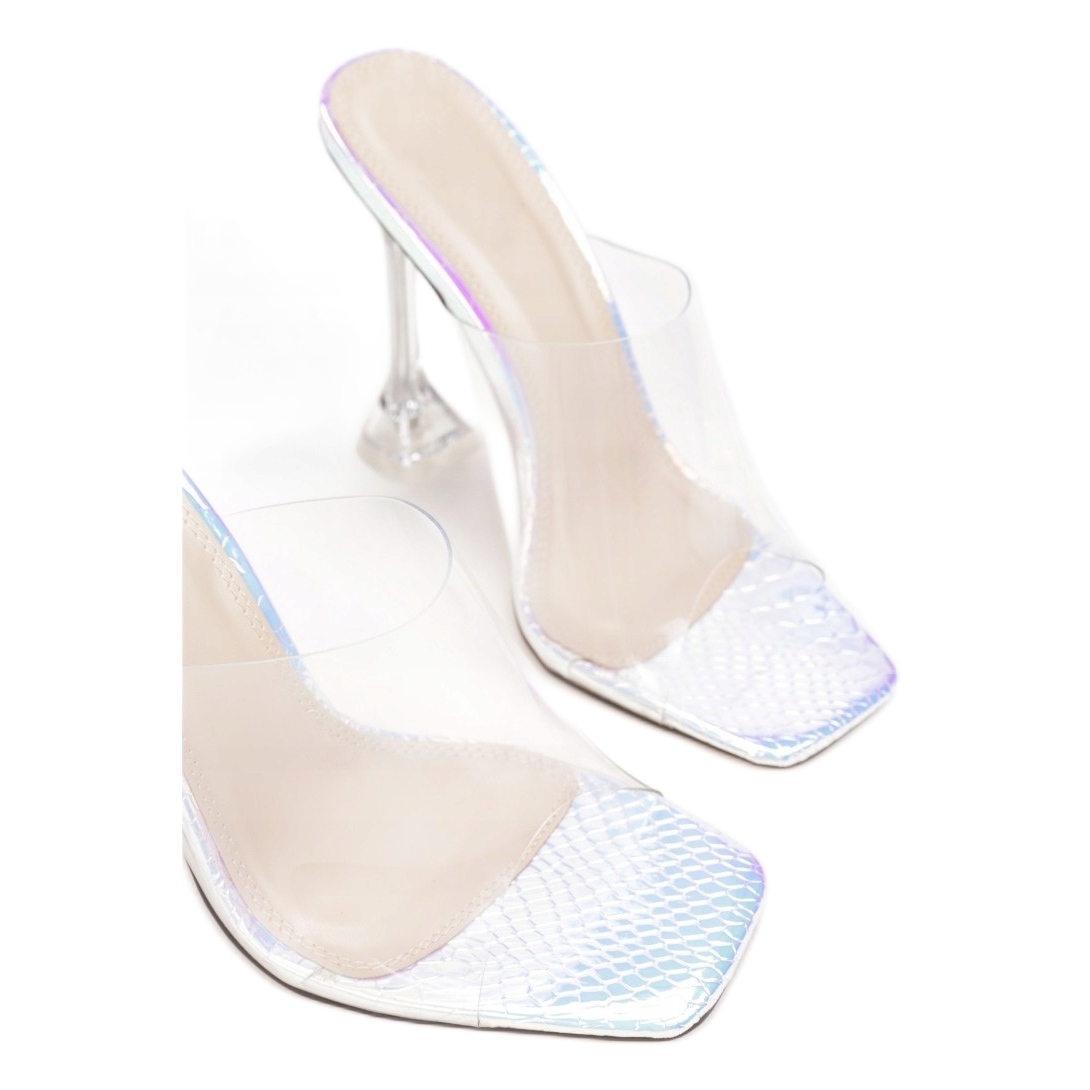 Acești șlapi sunt caracterizați de un deget rotunjit și degete deschise, ceea ce permite piciorului să respire liber și dezvăluie o manichiură elegantă. Cureaua transparentă din silicon se adaptează perfect piciorului, iar branțul metalic decorat cu relief în formă de solzi de pește le conferă un caracter unic.