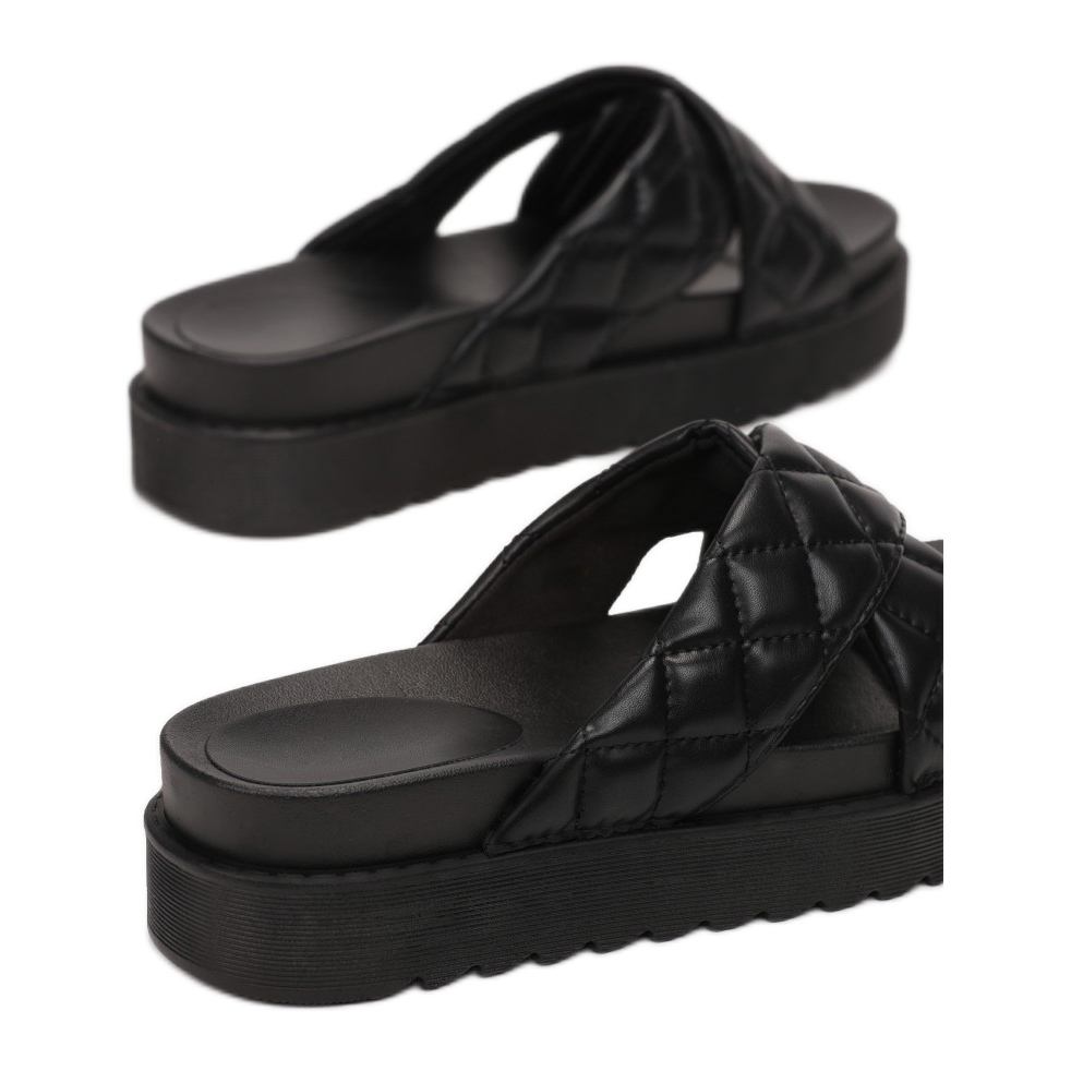 Partea din față a șlapilor este decorată cu bretele încrucișate acoperite cu matlasare subtilă în formă de romb, care nu numai că atrage privirea, dar adaugă și eleganță întregii încălțăminte. Curelele din piele ecologică de înaltă calitate sunt nu numai estetice, ci și durabile, asigurând confortul de purtare pe tot parcursul zilei.