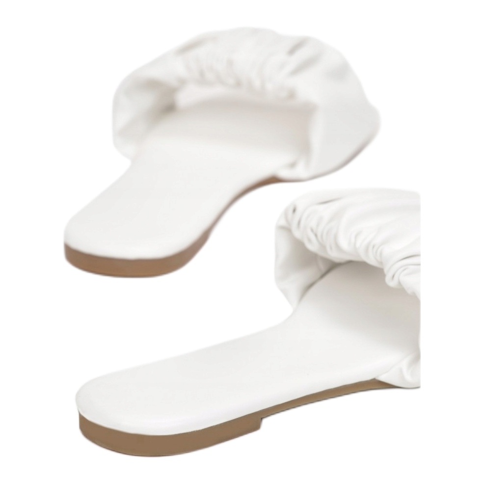 Fabricate din piele ecologică de înaltă calitate, aceste șlapi garantează durabilitate și ușurință de întreținere. Tocul lor plat, înalt de doar 1 cm, asigură confort la fiecare pas, făcându-le o alegere excelentă pentru utilizarea de zi cu zi. Talpa netedă, sintetică, subliniază caracterul modern al încălțămintei, iar lipsa degetului asigură o respirabilitate maximă.