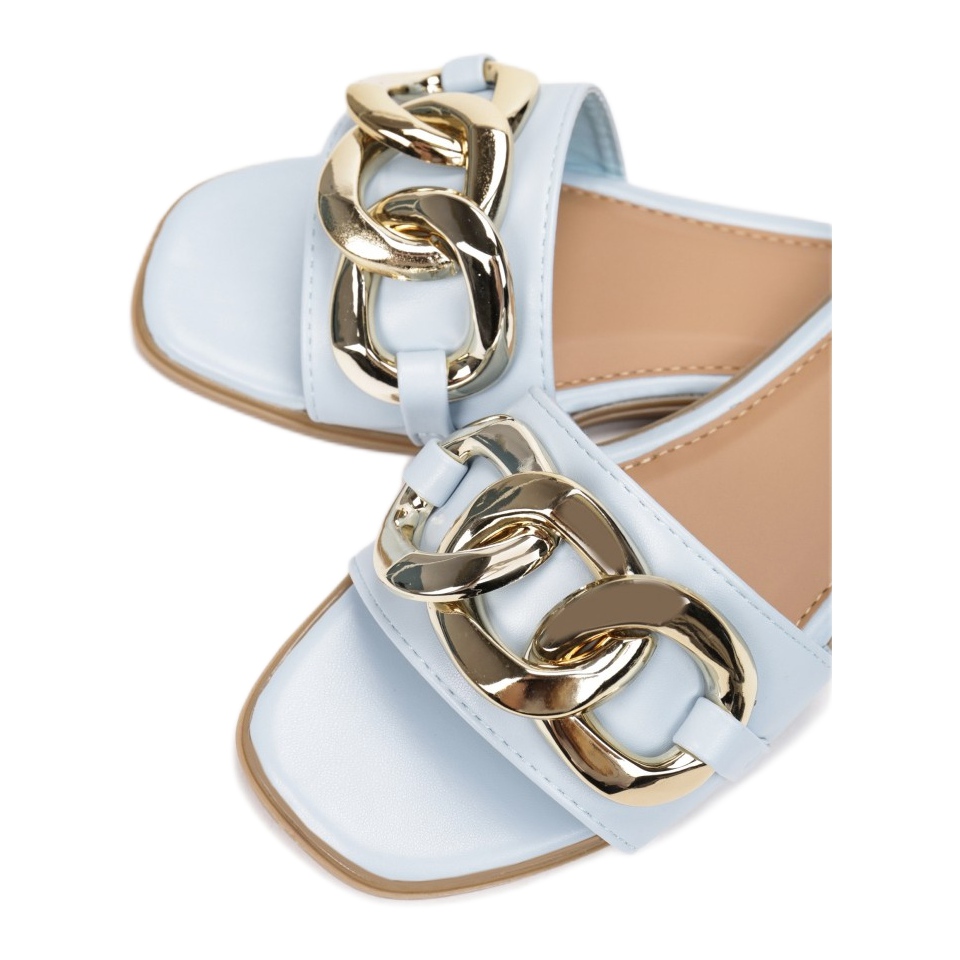 O curea lată pentru vârf, decorată cu un lanț elegant de culoare aurie, atrage atenția și subliniază stilul întregii perechi. Flip-flops sunt confectionati din piele ecologica de inalta calitate, atat in stratul exterior cat si in insert, ceea ce le face nu numai estetice, ci si ecologice.