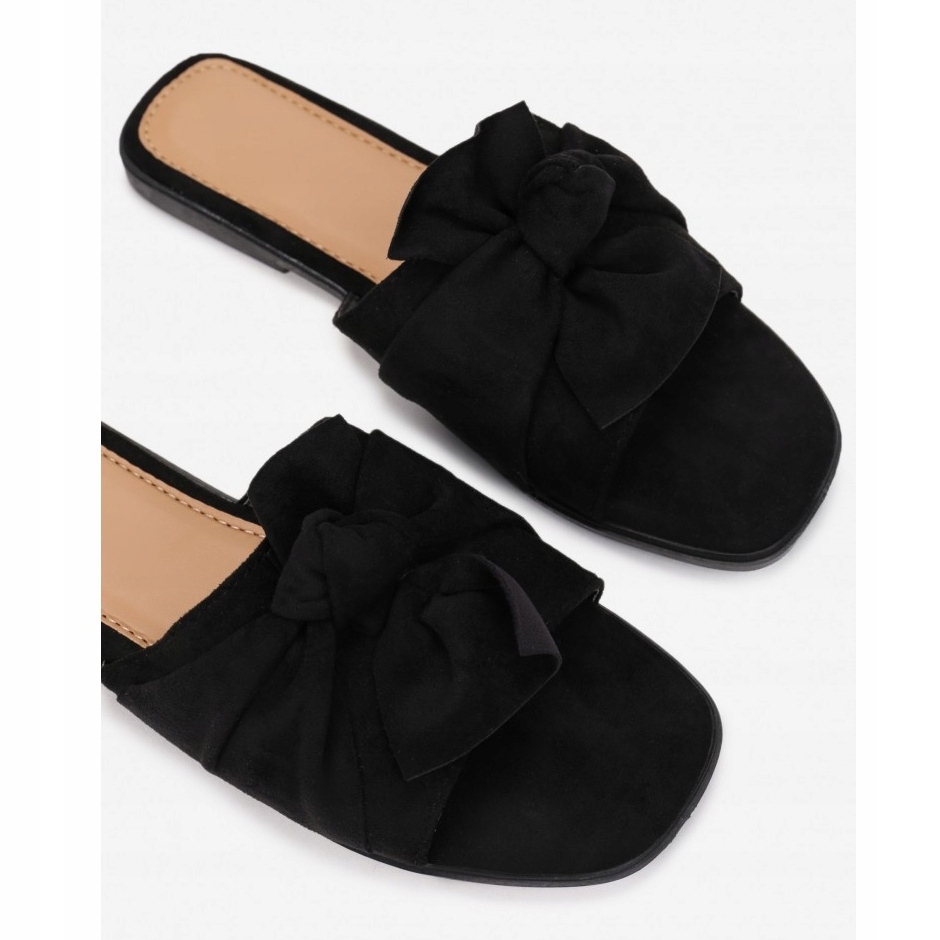 Așezate pe o talpă subțire cu toc plat, asigură confortul purtării pe tot parcursul zilei. O curea lată la degetele de la picioare, decorată cu un nod și o fundă, le conferă un caracter unic și le face atrăgătoare. Șlapii sunt confecționați cu grijă din piele de căprioară ecologică, iar branțul este o combinație de piele de căprioară ecologică și piele ecologică, care garantează durabilitate și confort de utilizare.