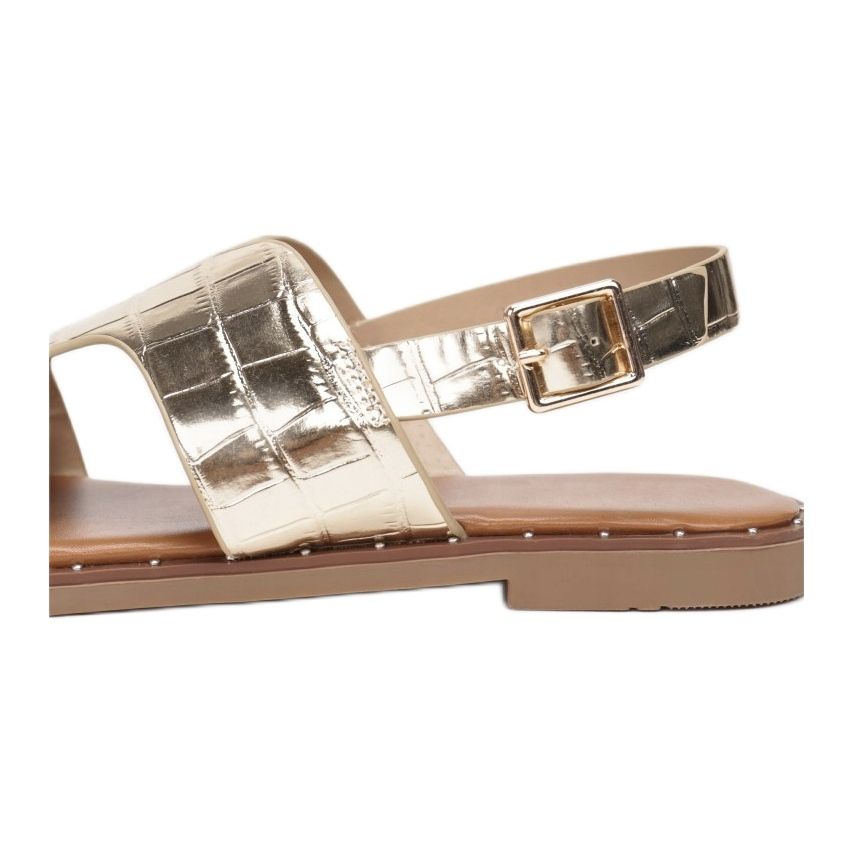 Aceste sandale plate clasice au o închidere cu cataramă deasupra călcâiului pentru o potrivire perfectă și o purtare confortabilă. Degetele deschise, tocurile și părțile laterale le fac perfecte pentru zilele calde, iar nuanța metalică de aur va adăuga strălucire oricărui stil.