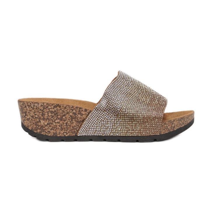 Șlapii sunt echipați cu o curea largă care ține ferm piciorul, adăugând în același timp un accent la modă. Fabricate din piele de căprioară ecologică de înaltă calitate, arată extrem de elegante. Un avantaj suplimentar sunt aplicațiile de bijuterii care imită zirconii, oferind încălțămintei strălucire și originalitate excepționale.